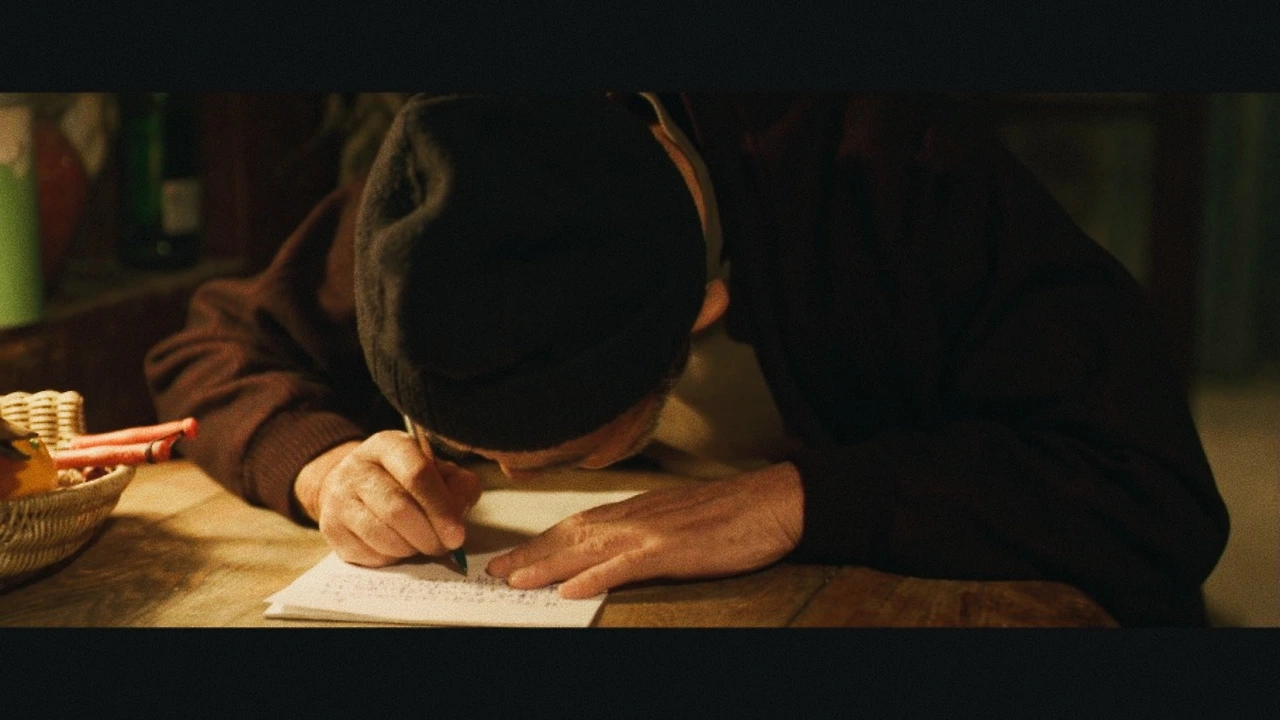 눈이 어두워진 아버지가 고개를 푹 숙여 편지를 쓰는 장면