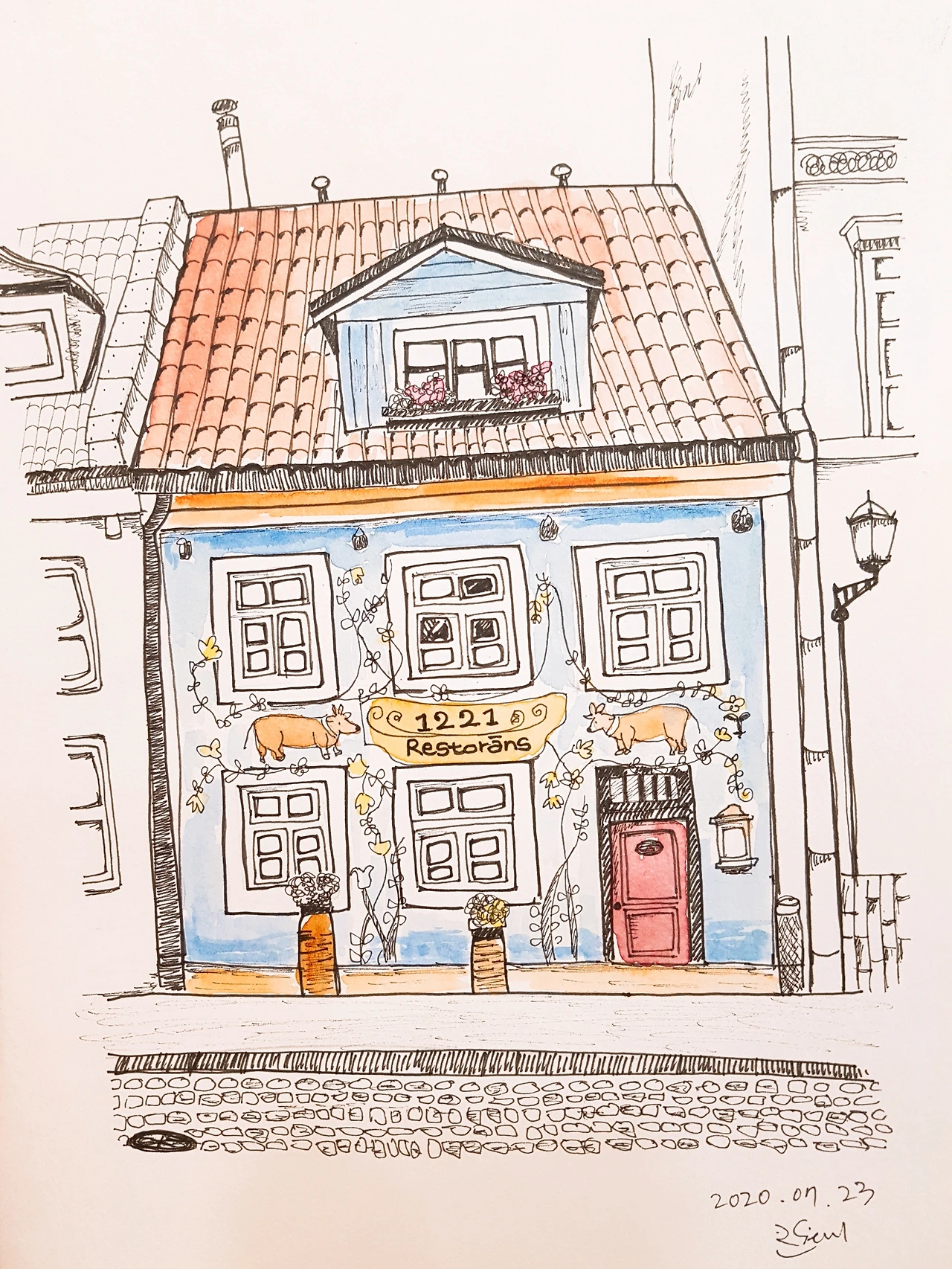 그날도 어김없이 퇴근 후, 다시 핸드폰 갤러리를 뒤적였다. 그 해 발트에서의 사진을 한 장 한 장 확대하며 찬찬히 살펴보다, 나는 어느 사진에서 멈춰버릴 수밖에 없었다. 어느 골목 풍경을 찍은 사진, 그리고 그 골목 끝에 빛을 받아 환하게 보였던 건물 하나. 펜 드로잉 시간에 앱에서 찾아 우연히 그리게 된 바로 그 건물이었다! 괜히 잘 그려진 것 같아, 카톡 프로필 사진까지 해두었던. 알고 보니, 그 건물의 모습이 이미 내 갤러리 한 켠에 있었던 것이다.