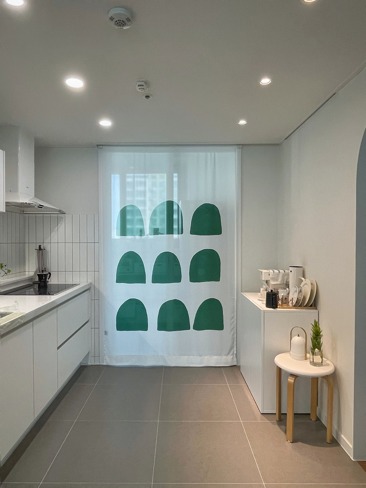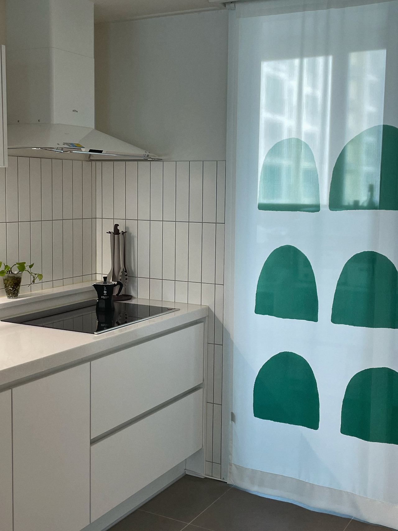 단순하게 커튼을 설치한 것뿐이지만, 왠지 다른 집에 온 것 같고 심지어 주방이 더 넓어 보이는 예상치 못한 효과까지 얻었다. 커튼에서 블라인드로, 다시 블라인드에서 커튼으로 고민을 수십 번 하고, 수많은 커튼 디자인 중에 이 발랄한 그림의 쉬폰 커튼으로 결정하는 데만도 아주 오랜 시간이 걸렸는데 다행히 커튼은 기대했던 것만큼 딱 상큼하고 적당히 깔끔했다. 톡톡 튀는 컬러와 배색을 많이 사용하여 발랄한 느낌의 패브릭을 제작하기로 유명한 꼭 써보고 싶었던 브랜드의 제품이라 더 기분이 좋은지도 모른다. 이 브랜드에는 다양한 컬러와 패턴의 제품들이 있지만 그중에서 제일 심플한 아이로 골랐는데, 화이트&그린을 사용하고 있어 목전에 다가온 봄을 조금 더 빨리 집에 당겨온 것 같아 설레는 기분이다. 한 계절에서 다음 계절로 넘어가는 시기에는 뭐든 이렇게 변화를 줘야 조금 더 살아가는 재미가 있는 법이다. 상큼한 기분도, 깔끔해진 모습도 금방 적응하겠지만 앞으로 몇 주 정도는 볼 때마다 기분이 좋을 것 같다.