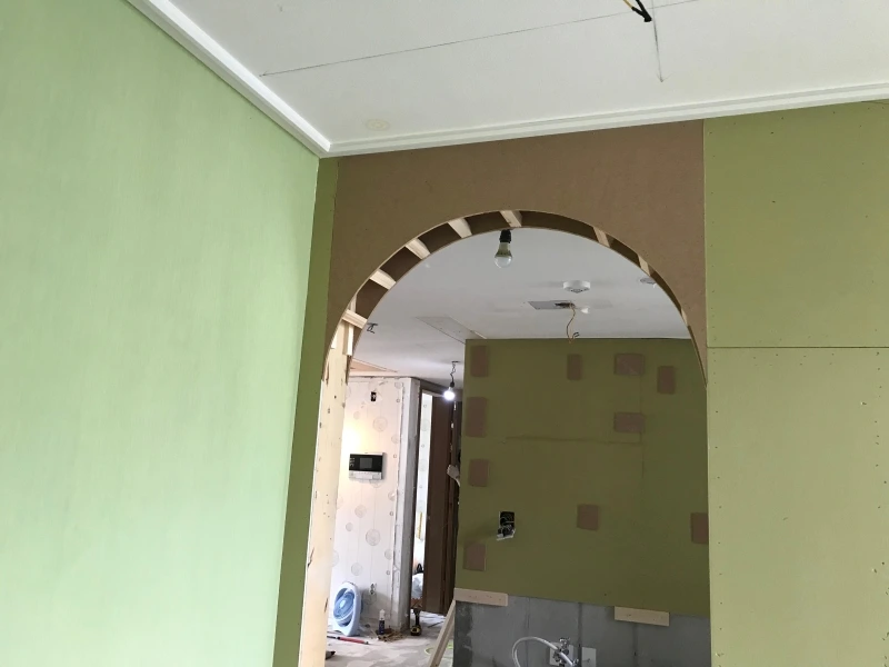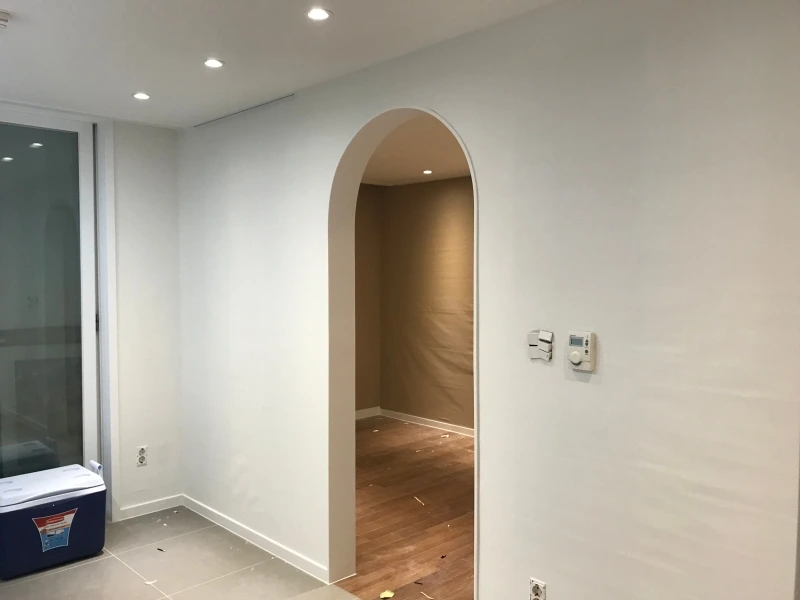 이제 어떡하지. 같은 아파트의 다른 시공사례를 보니 아예 이렇게 뜯어낸 채로 오픈형 주방 겸 다이닝룸을 만들었다. 하지만 이런 식으로 하면 방이 하나 없어지는 것 아닌가. 어차피 다이닝룸으로 사용할 예정이기는 했지만 나는 공간을 분리해서 꼭 방 세 개를 유지하고 싶었다. 그렇다면 어쨌든 새로 벽을 쳐야 한다. 나는 인테리어 카페에서 유명한 목공 사장님을 섭외해서 가벽 설치를 요청드렸다. 그리고 이제 문을 달아야 하나? 아니, 재미없는 문보다는 포인트로 아치게이트를 만들어볼까.