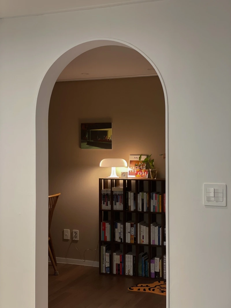 거실에서 서재/다이닝룸을 바라보면 아치 속 공간이 아주 아늑하게 보인다. 이 방에는 전구색 등과 조명만을 넣었고 포인트로 웜브라운 톤의 벽지를 도배했기 때문에 어떻게 보면 그것은 당연한 일이며 나의 의도가 정확히 반영되었다는 점에서 뿌듯한 일이기도 하다. 이런 톤의 벽지를 찾기 위해 얼마나 많은 벽지를 봤는지 모른다. 벽지 브랜드의 컬러북을 죄다 가져와서 벽에 세워보고, 조명을 꺼보고, 또 켜보고, 낮일 땐 어떻고 밤일 땐 어떤지까지도 확인했다. 그렇기에 나는 이 방의 노랗고 따스한 분위기부터 식탁, 책장 등의 가구들, 벽지, 그리고 아치게이트에 이르기까지 모든 요소를 사랑하며 이 집에서 내가 가장 좋아하는 방을 묻는다면 단연코 이 방을 얘기할 것이다.
