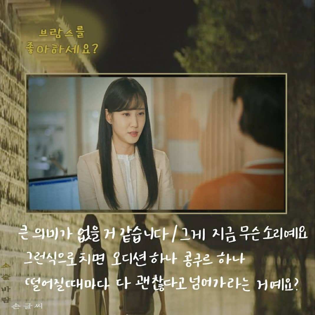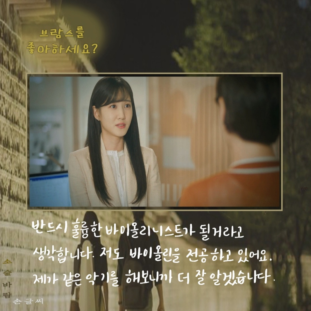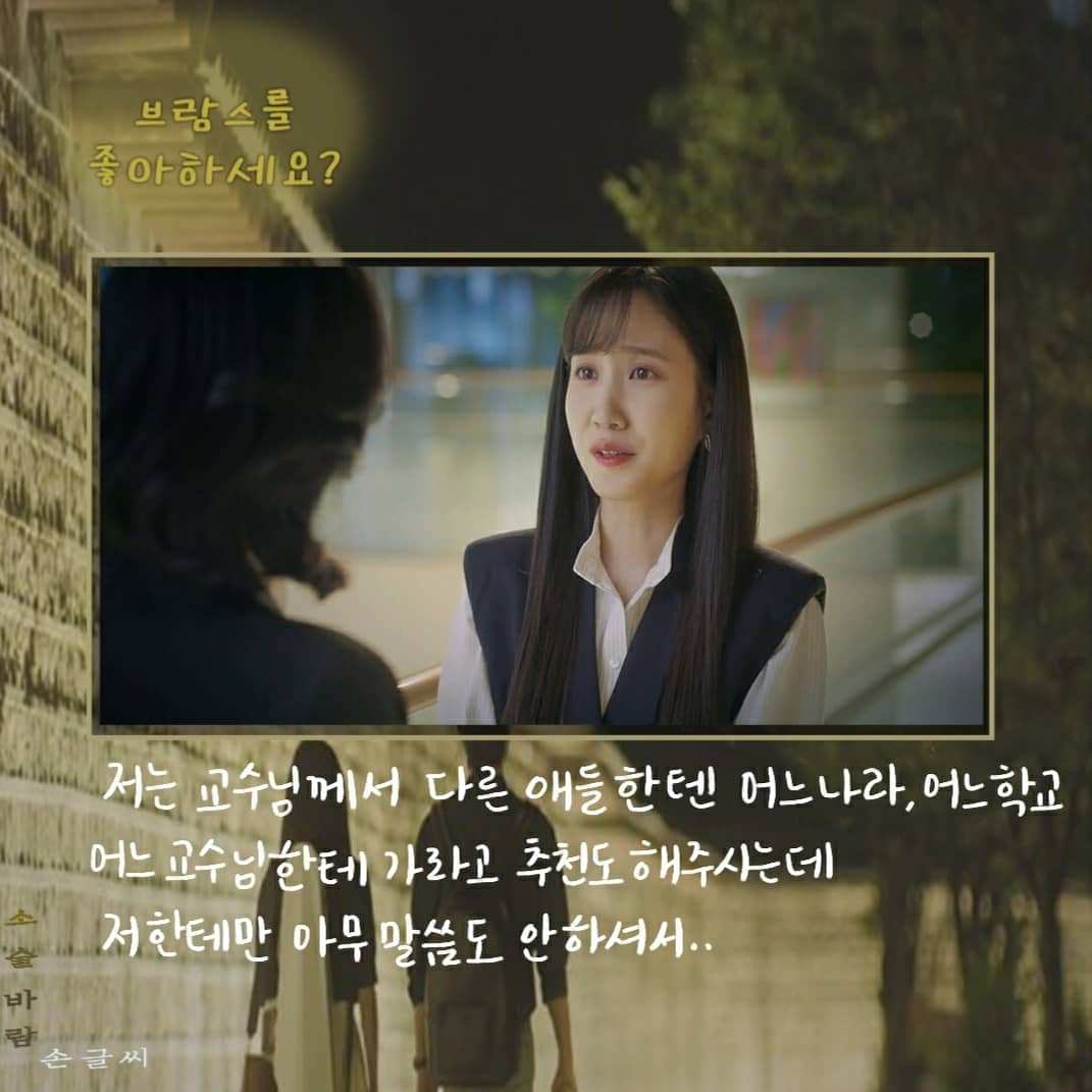 송아의 지도교수는 오로지 인맥 때문에 송아에게 대학원 진학을 권유한다. 4년 동안 지켜봤는데 다른 애들보다 음악을 늦게 시작해서 실력이 별로 안 늘어서 마음이 갔다고 한다. 마음에도 없는 말을 하는 이교수의 대사로 <청춘 기록>의 대사가 떠올랐다.