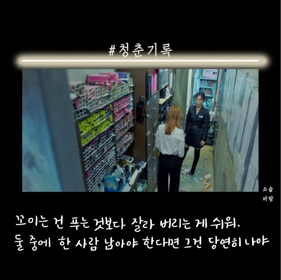 내 눈엔 진주는 점점 치고 올라오는 정하를 질투하는 게 아닐까 싶다. 그래서 더 괴롭히고 기싸움하는 건가 싶다. "꼬이는 건 푸는 것보다 잘라 버리는 게 쉬워. 둘 중에 한 사람 남아야 한다면 그건 당연히 나야"하며 정리돼있는 샘플 통을 바닥에 던져버린다.