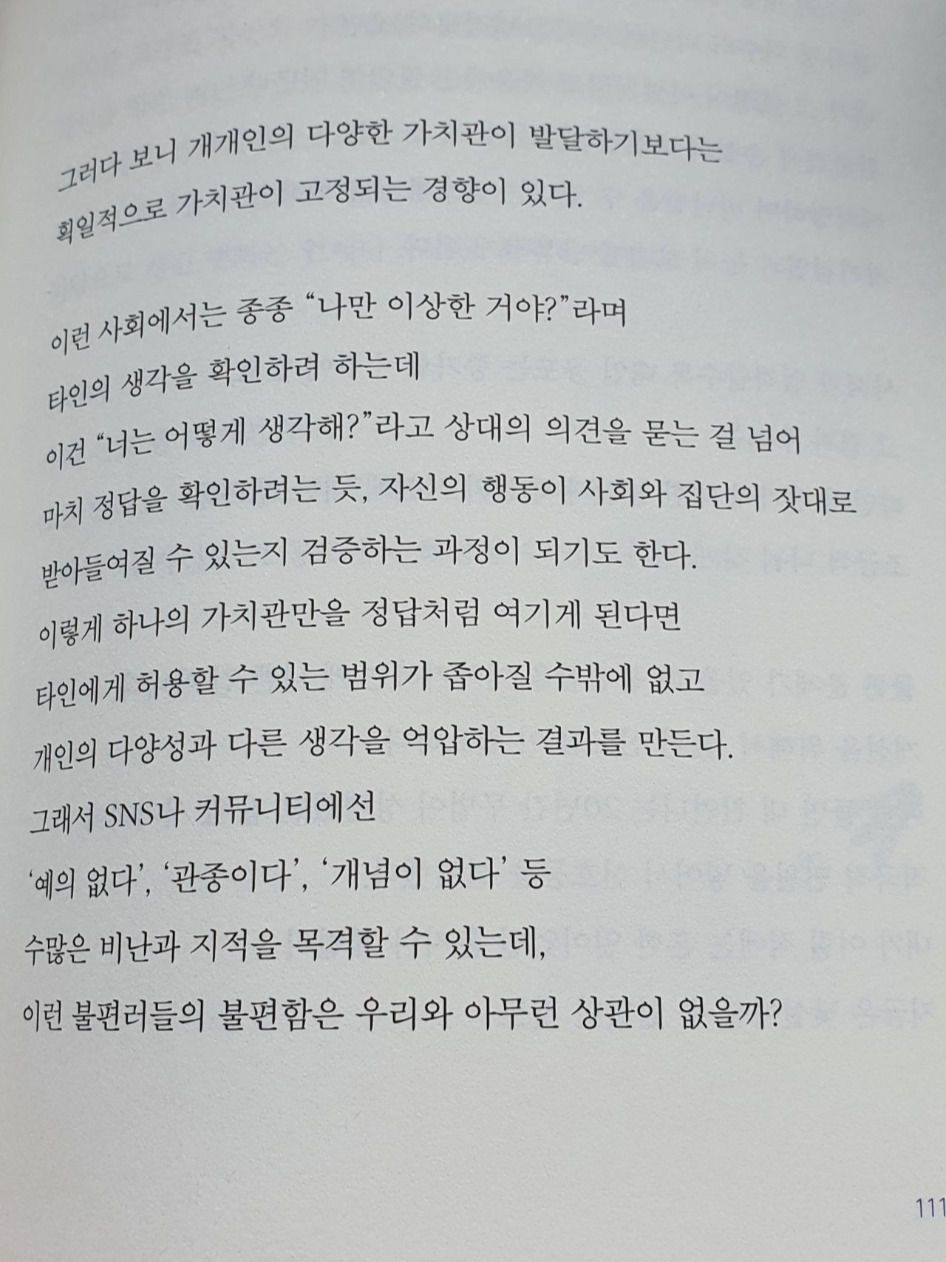 우리는 모두 타인이며 살아온 방식이 다르다. 사회에 나오기 전까지는 가정에서 배운 나의 세계가 있다면, 사회에 나오면서부터는 사회에서 주입시켜주는 것들을 장착하게 된다. 그리고 사회에서 규정지은 행동 외에 다른 행동들을 보이면 그 사람을 사회에서 매장시켜 버린다.
