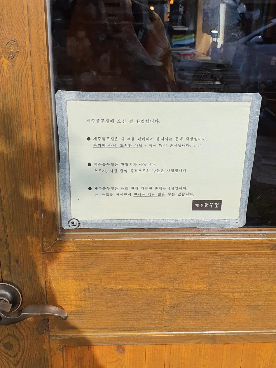 집 근처로 넘어와 풀무질에 왔다. 건너편엔 지난번에 갔던 가는곶세화가 있는 곳이다. 단순히 사진만 찍고 책을 훼손하는 경우가 많았나 보다. 안내문을 읽고 조심스럽게 책방으로 들어간다.
