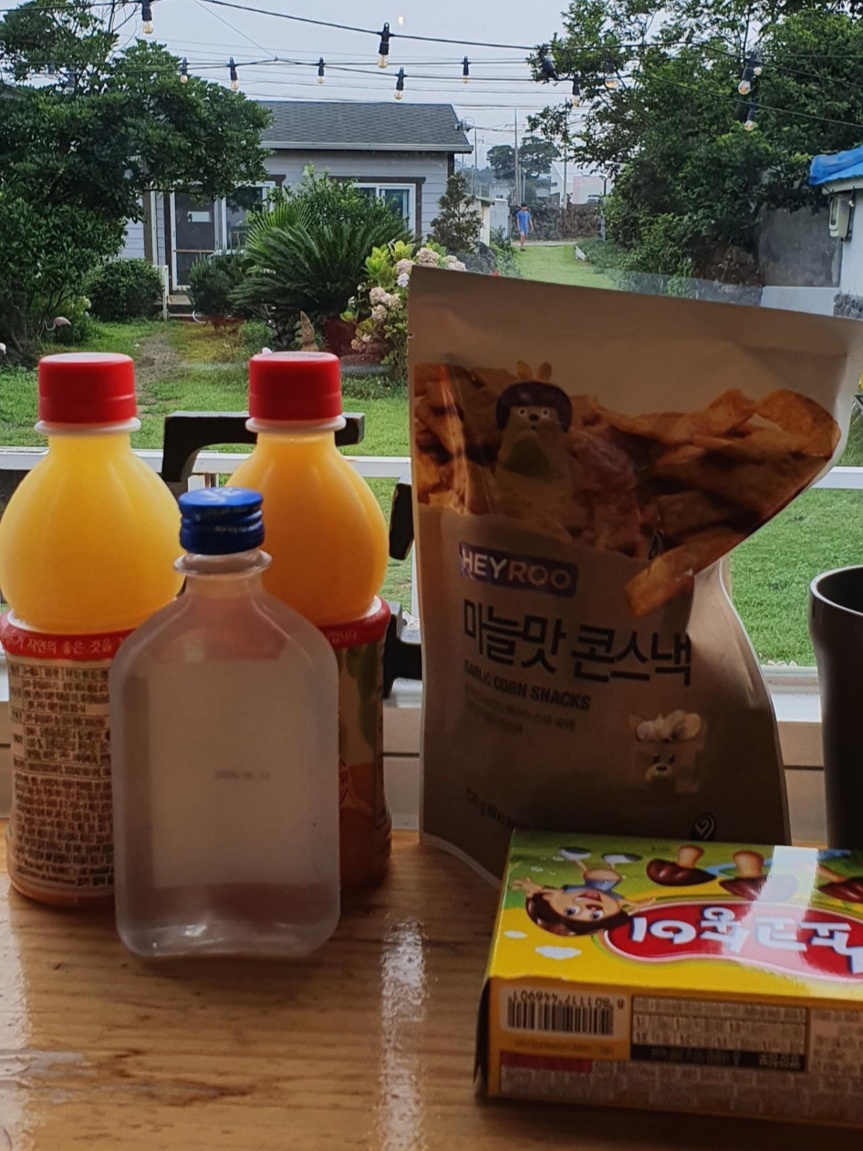 이번에 정말 많이 먹은 과자가 마늘맛콘스낵인데, 일명 나나콘이다. 고등학생 때 처음 먹었던 거 같은데 이게 술안주로 딱이다. 친구가 알려준 오렌지 소주를 마시며 하루를 정리했다.