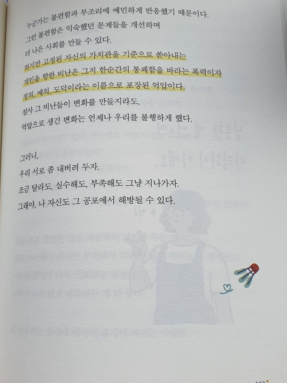 나라고 그런 적이 없었을까. 과거의 내 행동에 부끄러워지는 순간들이 하나 둘 수면 위로 올라왔다. '저 사람은 왜 저래? 진짜 이상하지 않아?', '얜 내가 보기에 진짜 미친 거 같아'라는 말을 서슴없이 내뱉었다. '저렇게 행동하면 안 되는데, 이건 이거고 저건 저거지'하며 평가했던 순간도 있었다.
