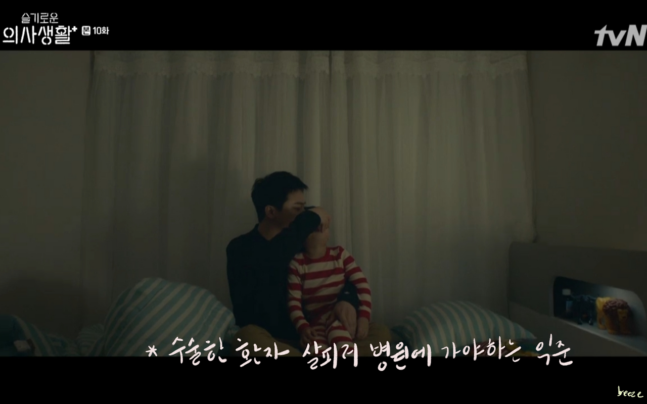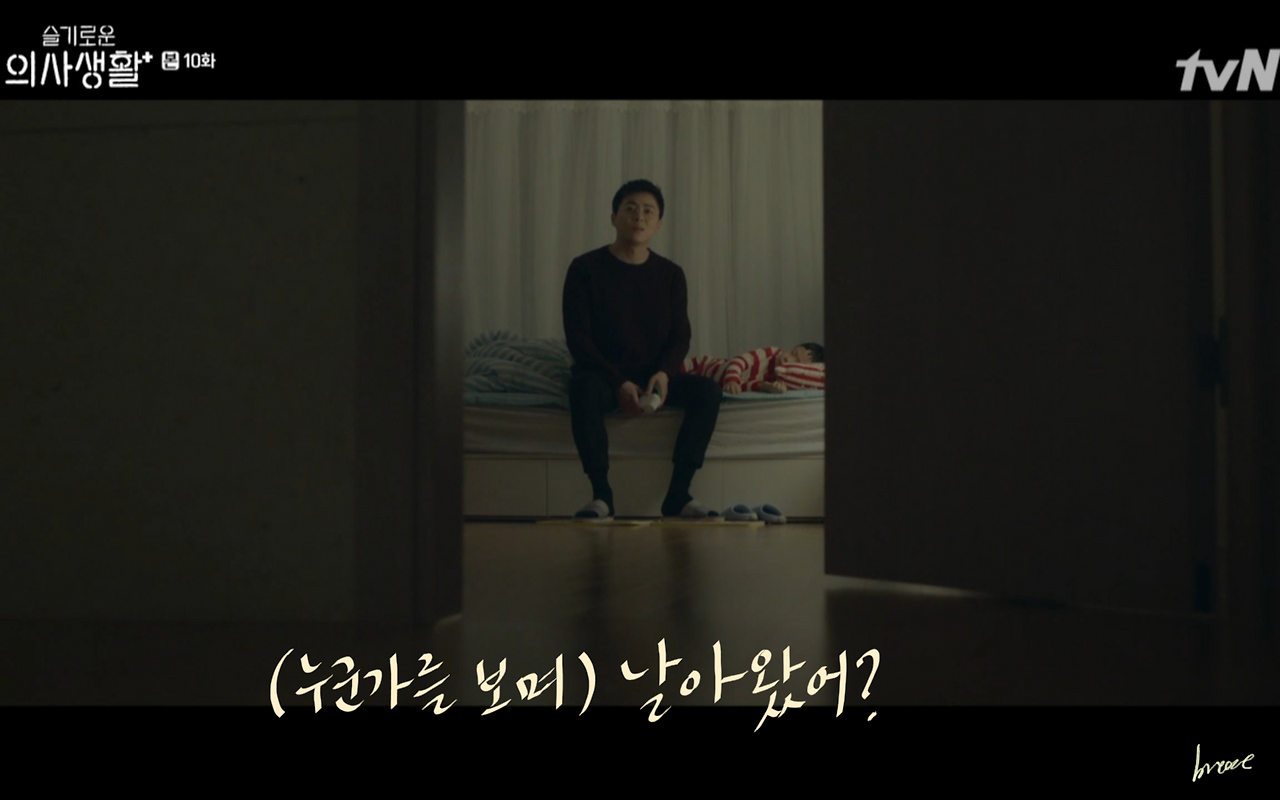 송화는 자연스레 우주의 상태를 얘기한다. 새벽에 아이의 열을 내리기 위해 엄마에게 전화해 방법을 물어봤다는 송화의 얘기에 익준은 미안해한다. 하지만 그 모습이 꼭 부부의 모습과 같아 보여 괜스레 미소를 지었다
