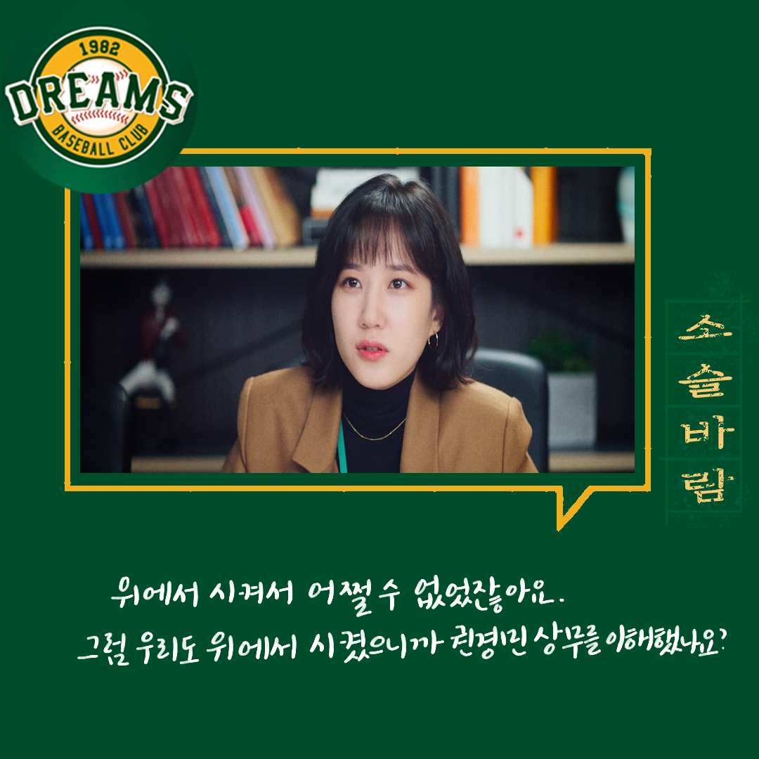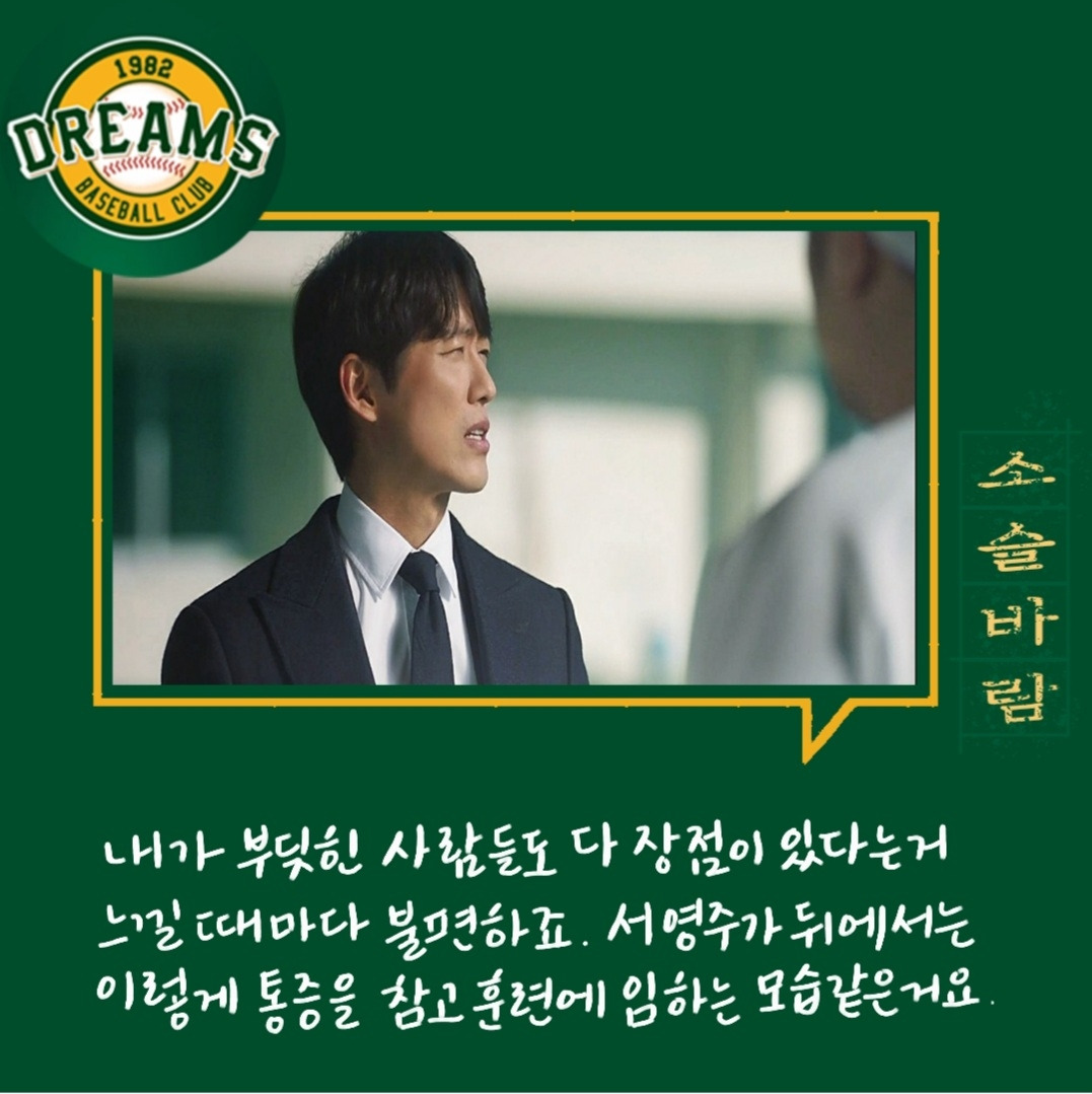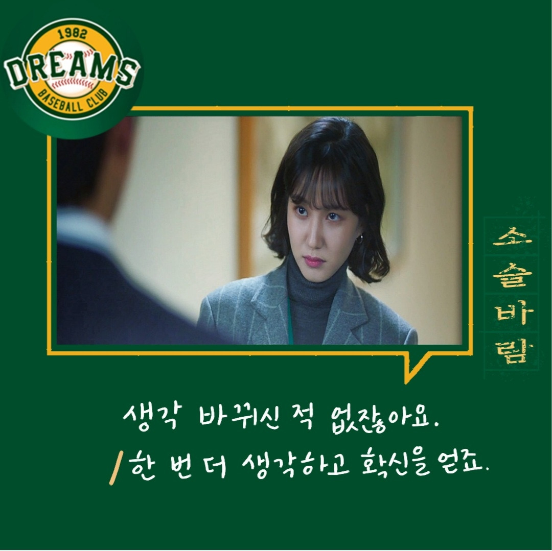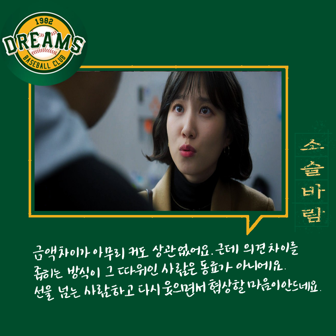다양한 사람들. 다양한 의견들. 의견의 차이를 좁히는 방식들. 매번 한 사람의 말만 맞을 수 없다. 그래서 여러 사람의 의견을 들어보고 결정하는 게 좋다. 그 사이에 갈등도 현명하게 풀어내야 한다. 백승수는 언제나 여러 말을 듣고 판단하고 결정한다. 야구인생으로만 보면 세영이 선배지만 위치는 승수가 더 높기에 세영은 단장이 틀렸다고 생각했지만 한 번 믿어보기로 했다.