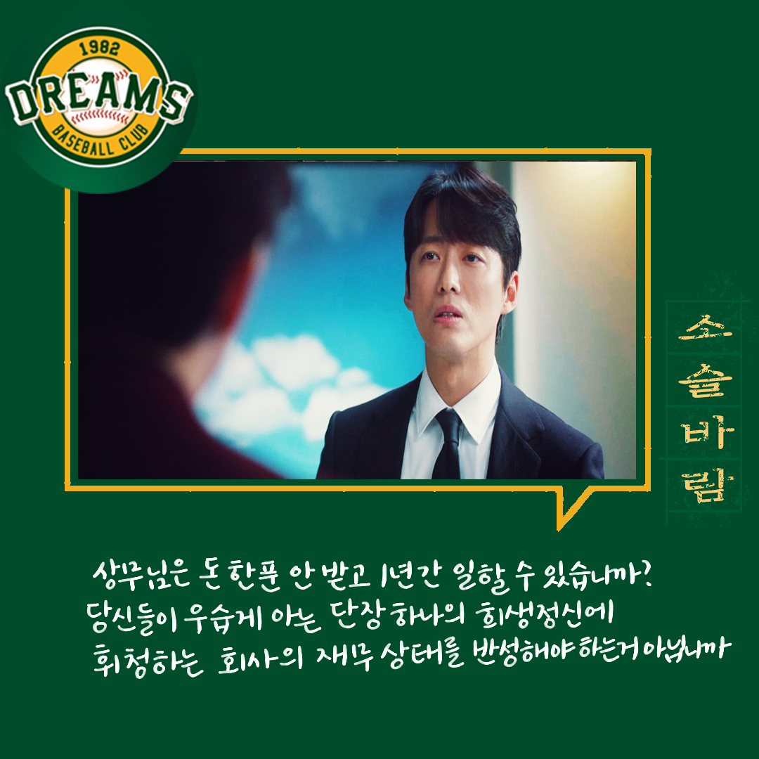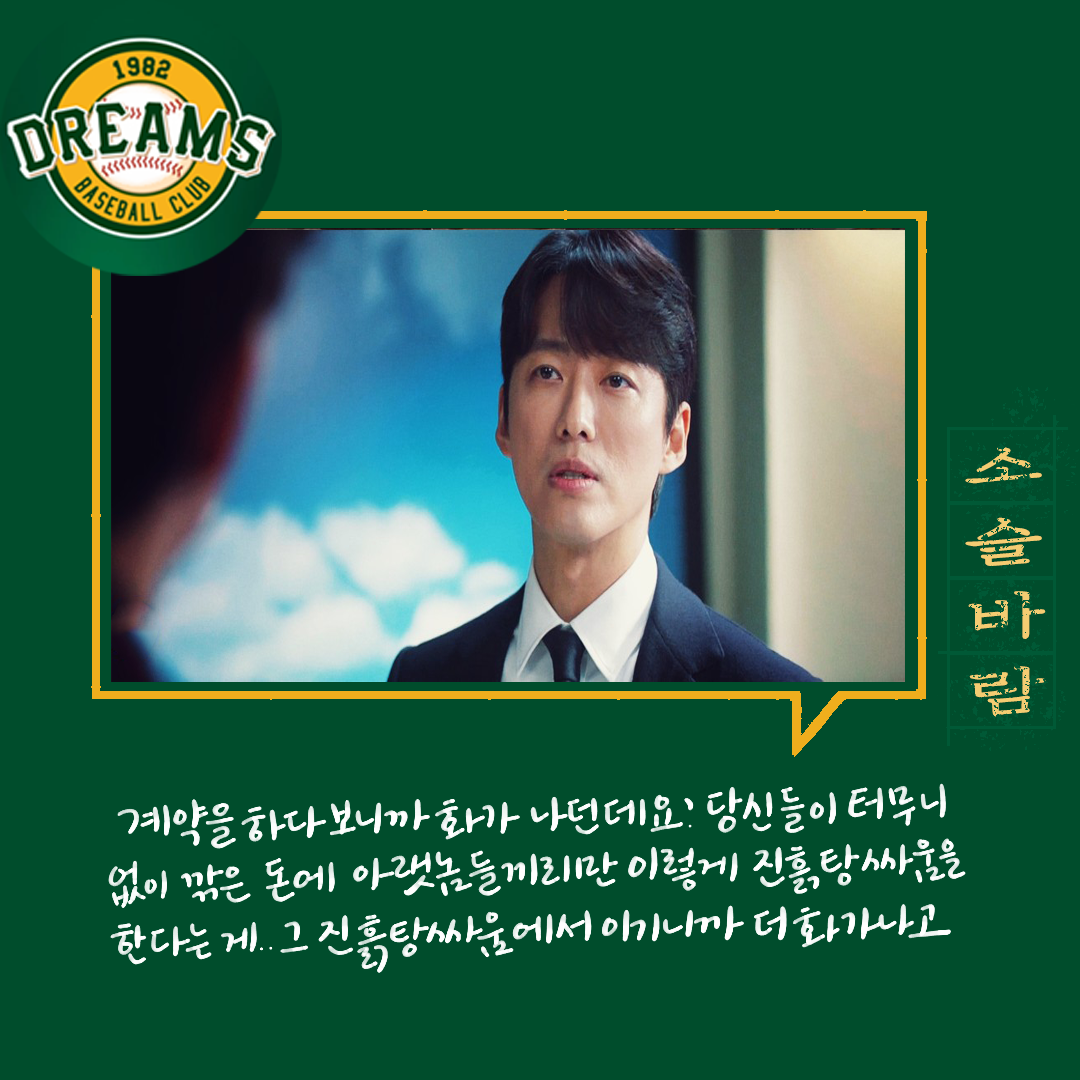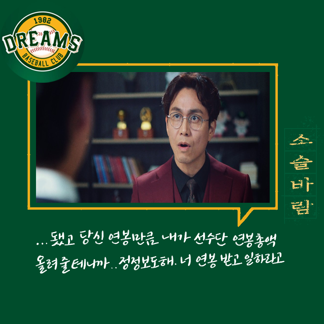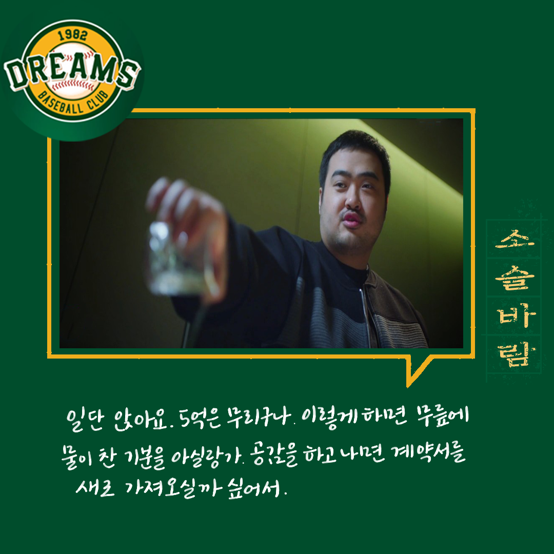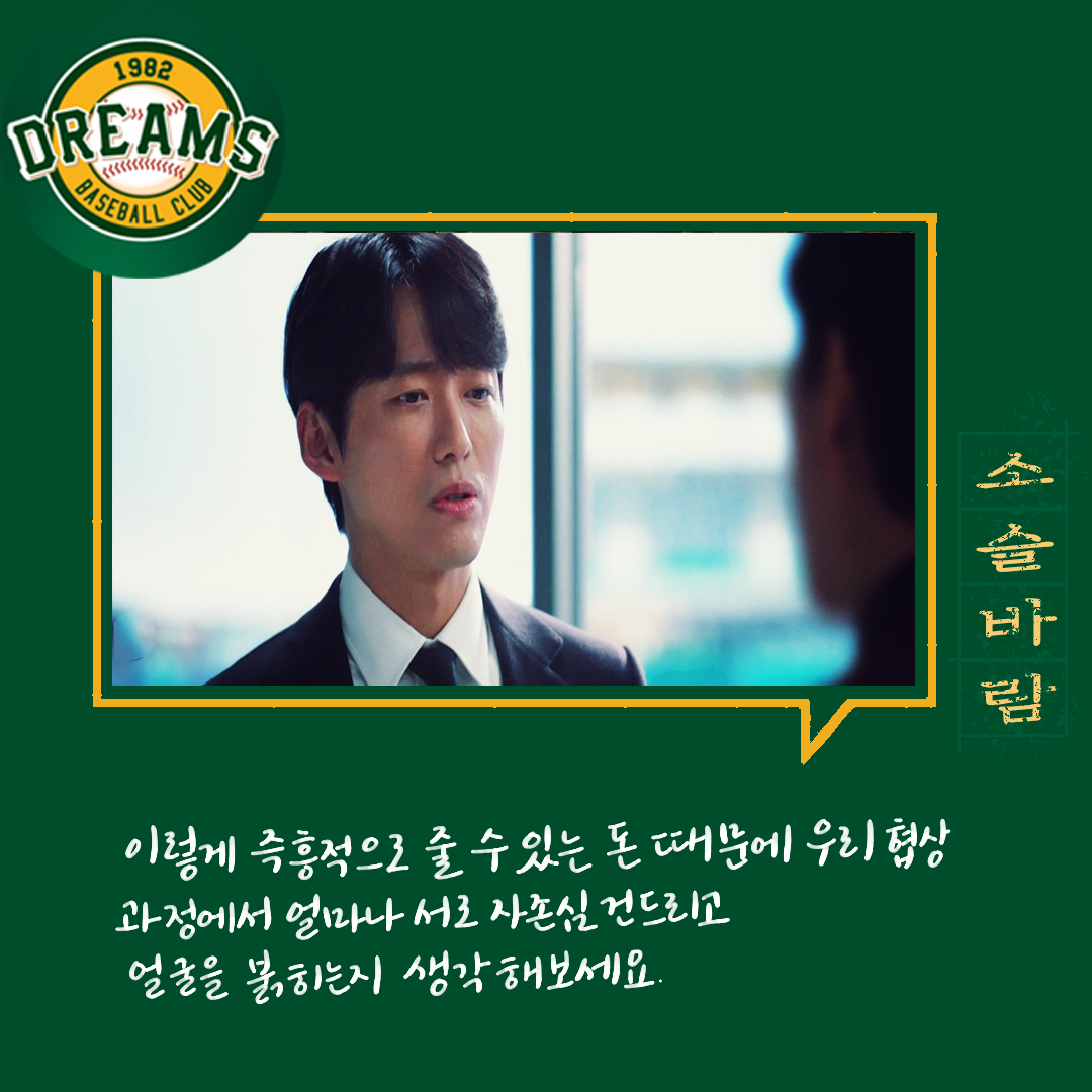 세상에 돈 싫어하는 사람 있을까.. 돈 필요 없는 사람은 또 어디 있나... 최저 야구 비용이 3천만 원이라고 드라마에서는 나오던데. 일반인에겐 음.. 내겐 연봉 3천은 어마어마하게 큰돈인데. 야구선수에게는 이게 적은 돈이라니.. 근데 그 적은 돈에서 더 깎으려 했다니. 그것도 즉흥적으로.