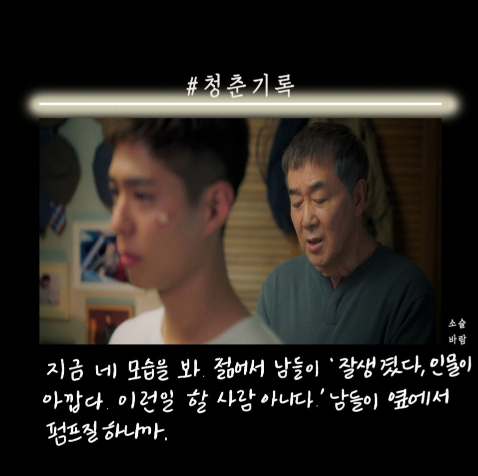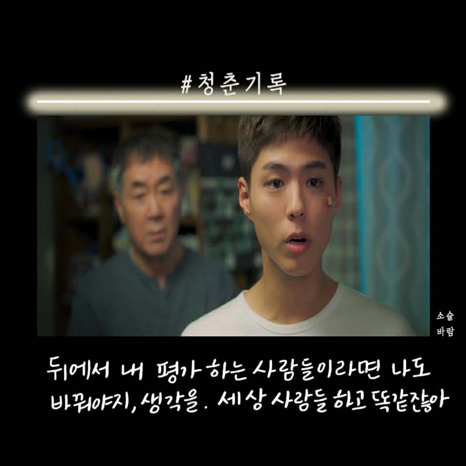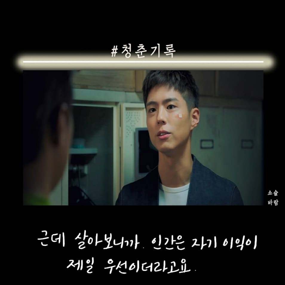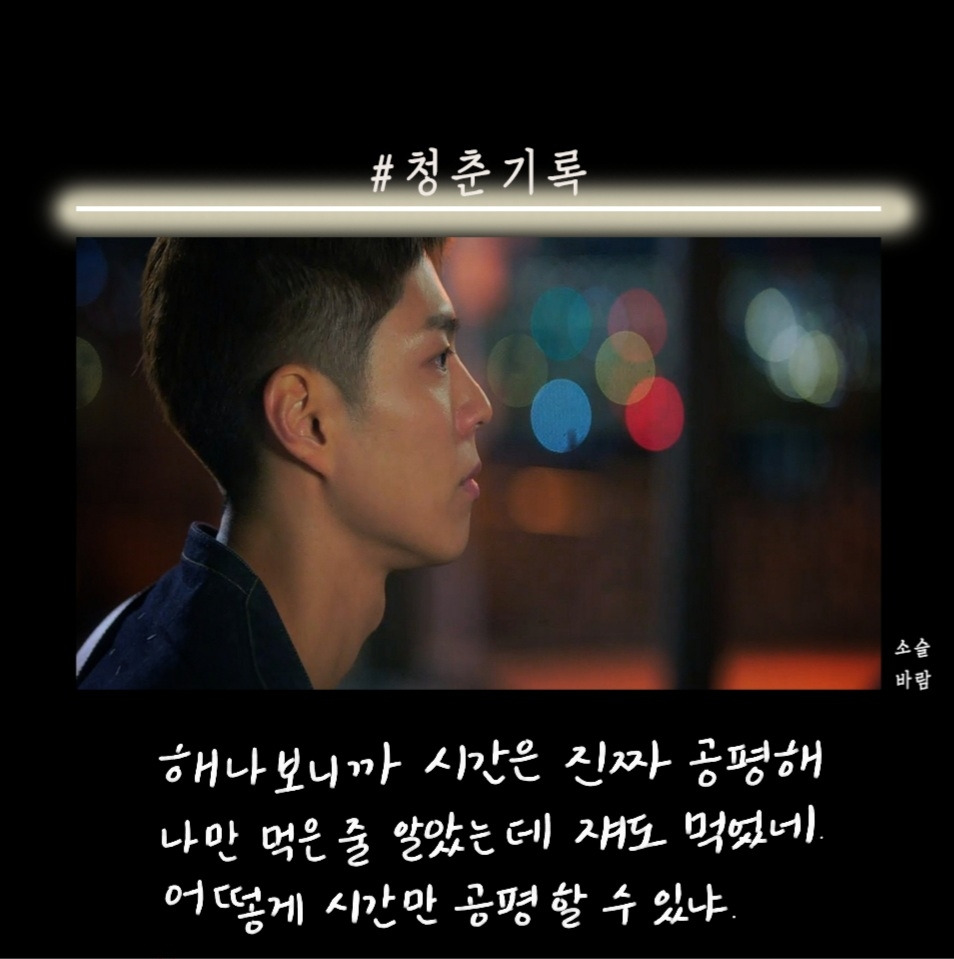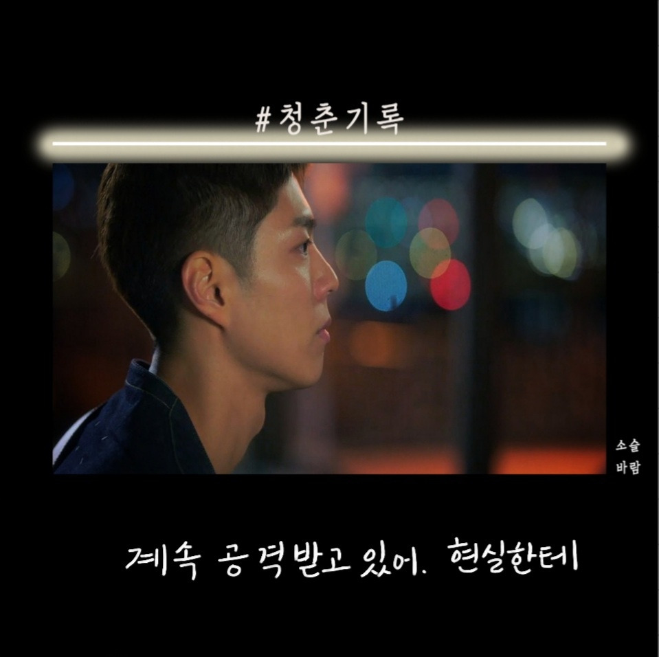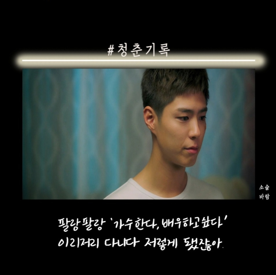 박보검이 군 입대하기 전 마지막 작품으로 찍은 청춘 기록이 방송됐다. 첫 화를 보고 오? 했다. 응답하라 1988을 보고 바로 청춘 기록을 본 거기 때문에 박보검의 외모에 좀.. 적응이 안됐다. 청춘이라는 말이 들어가서 그런지 드라마는 사이다, 공감 대사가 많았다.