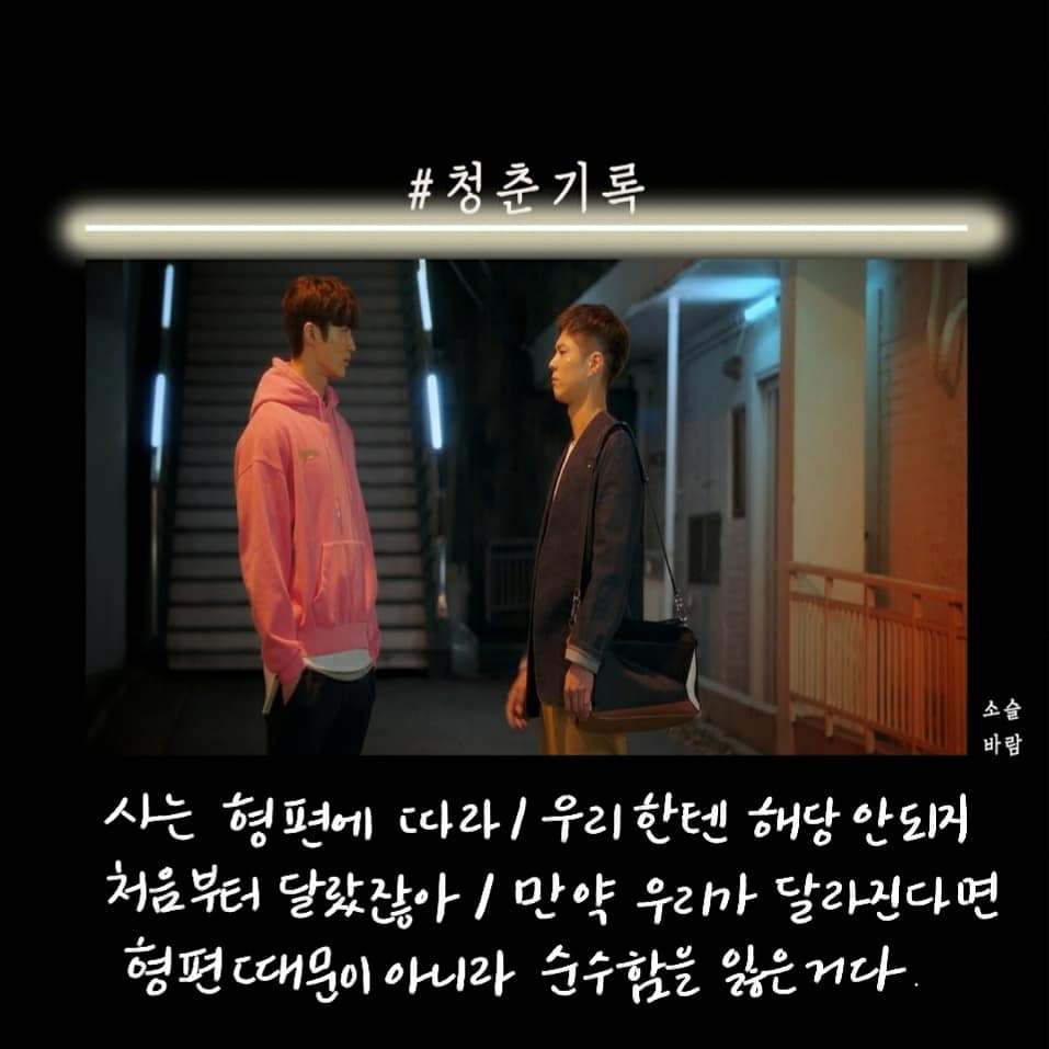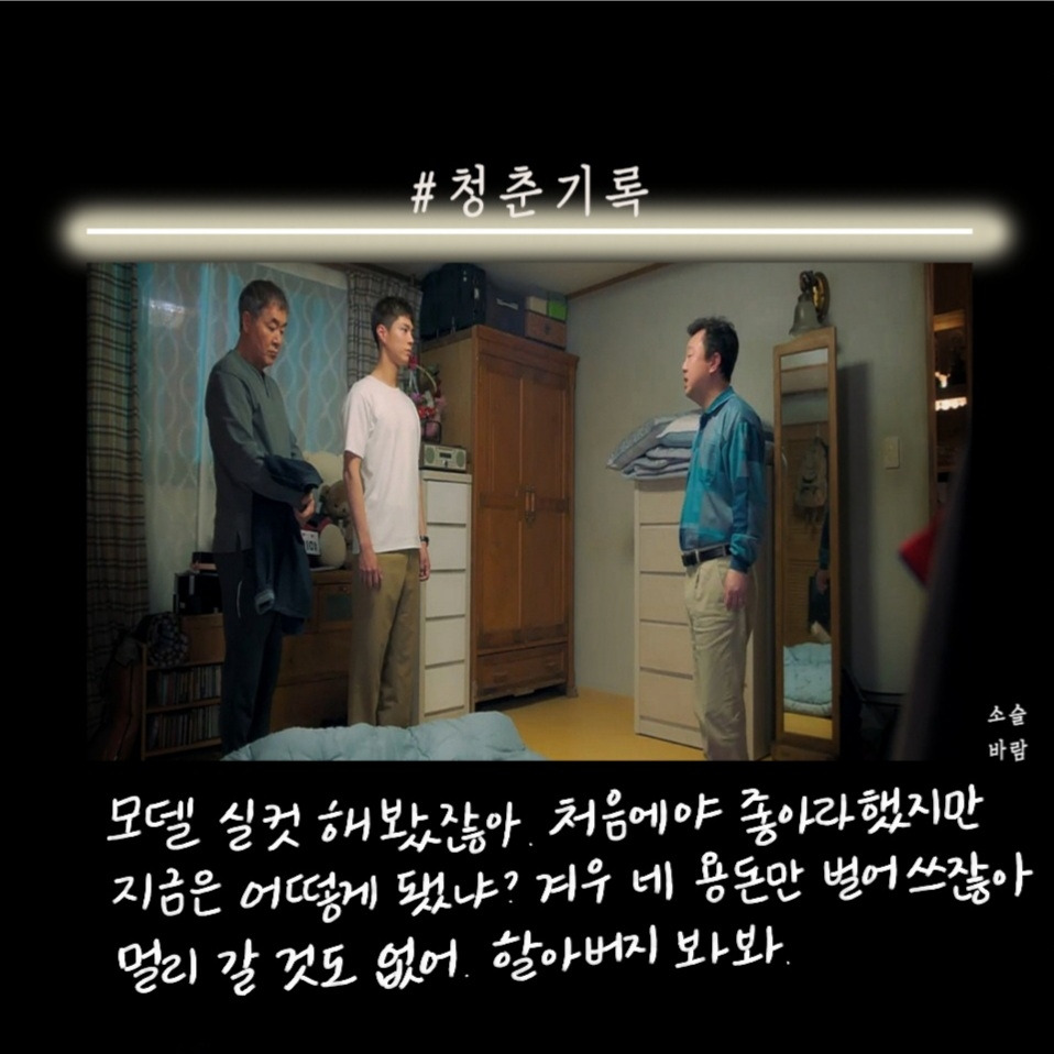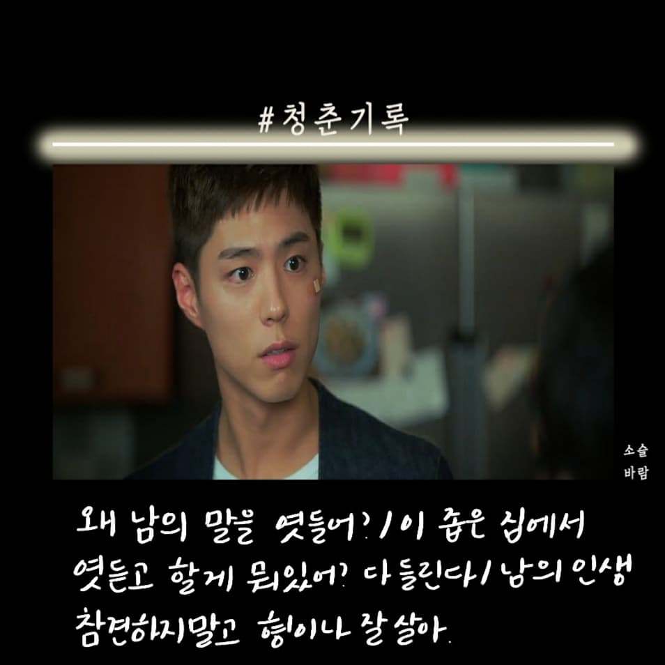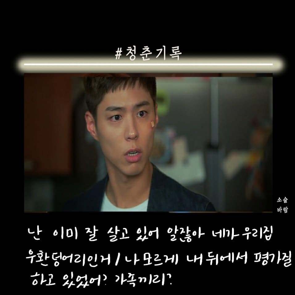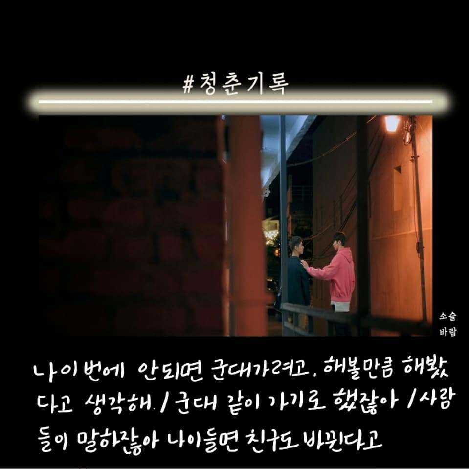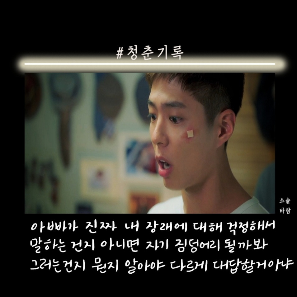 박보검이 군 입대하기 전 마지막 작품으로 찍은 청춘 기록이 방송됐다. 첫 화를 보고 오? 했다. 응답하라 1988을 보고 바로 청춘 기록을 본 거기 때문에 박보검의 외모에 좀.. 적응이 안됐다. 청춘이라는 말이 들어가서 그런지 드라마는 사이다, 공감 대사가 많았다.
