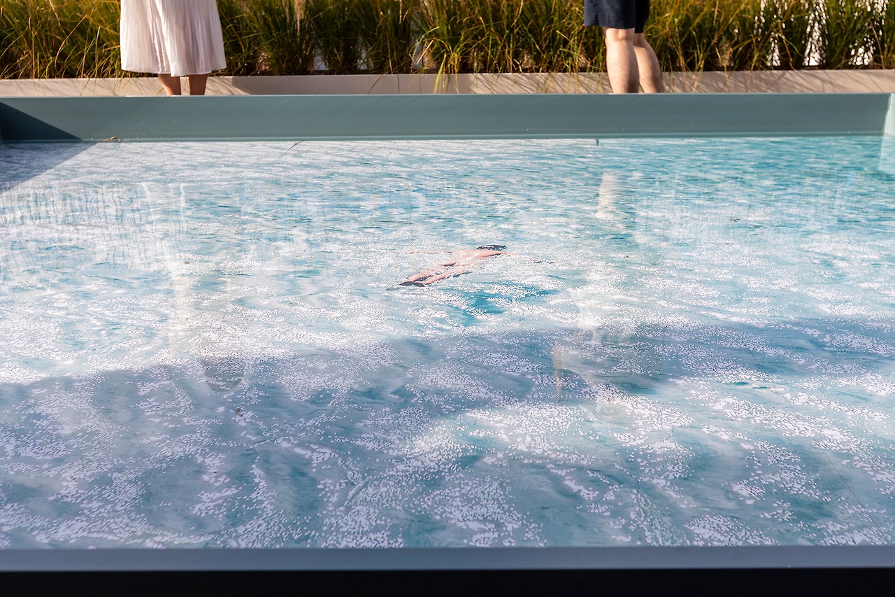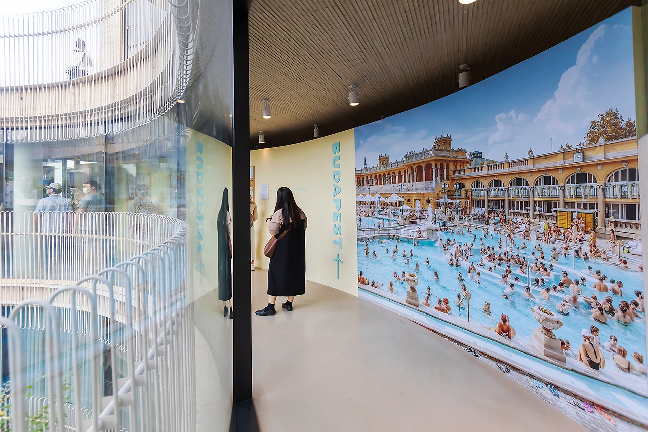 PART 3 사진이 열리는 층에서 야외 무대로 연결되는데요, 야외 무대에는 이번 사진전의 대표 격인 사진이 "설치"되어 있습니다. '설치 미술'처럼 '설치 사진'이라 해야 할지요? 수영하는 남자의 사진을 수영장에 담가(?) 놓았어요. 가을이 막 도착한 서촌 풍경과 물, 요시고의 사진이 매우 잘 어울린다고 생각했습니다.