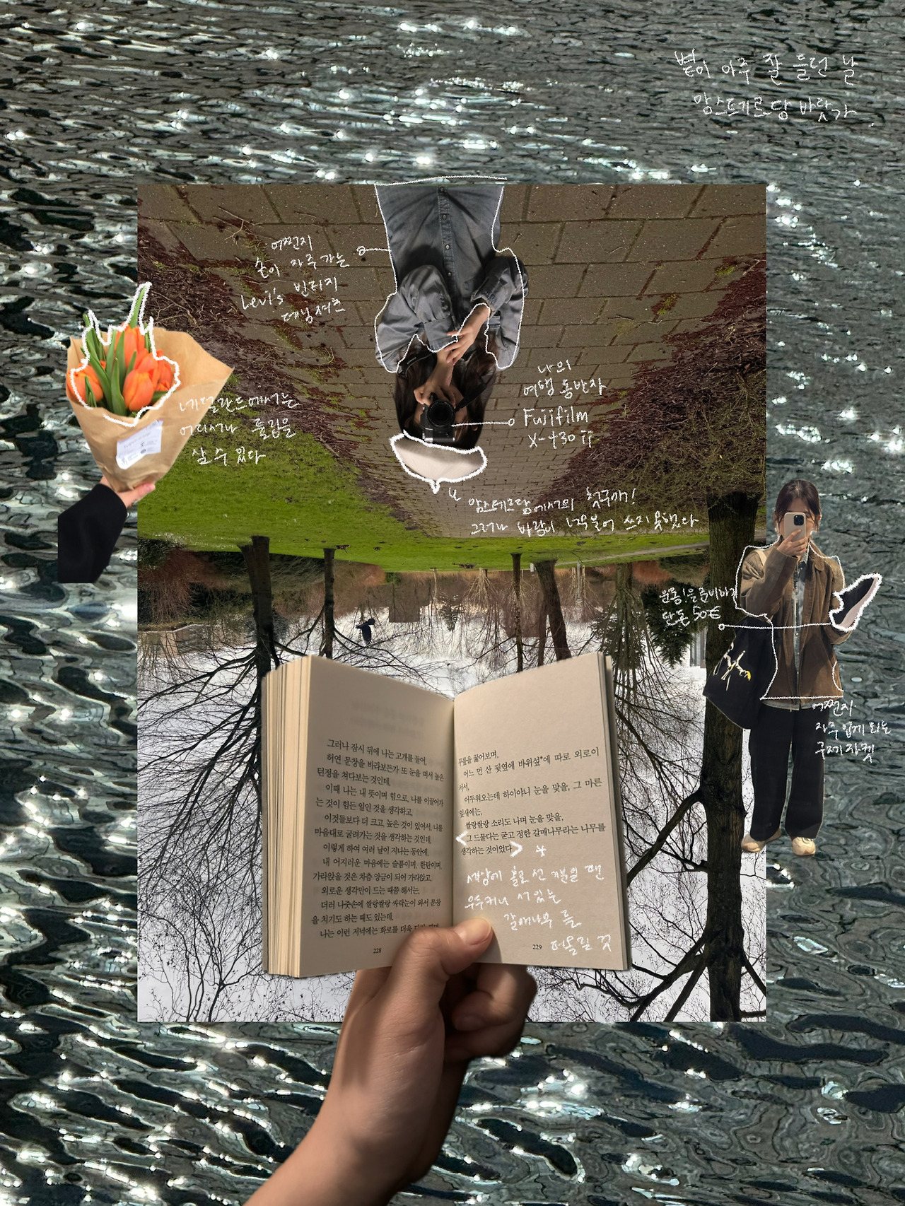 이런저런 주석을 달았어. 내겐 성경이나 다름없는 시집, 어디서나 살 수 있는 튤립, 아주 꽉 들어 찬 캐리어에 굳이 끼워 넣었던 구제 데님 셔츠와 재킷, 아주 귀한 햇빛이 담긴 강물, 흐리고 앙상한 나무... 디지털이지만 마치 패치워크처럼, 혹은 잡지 속 글자를 잘라 붙이는 콜라주 작업처럼 조각조각을 기워 봤어.