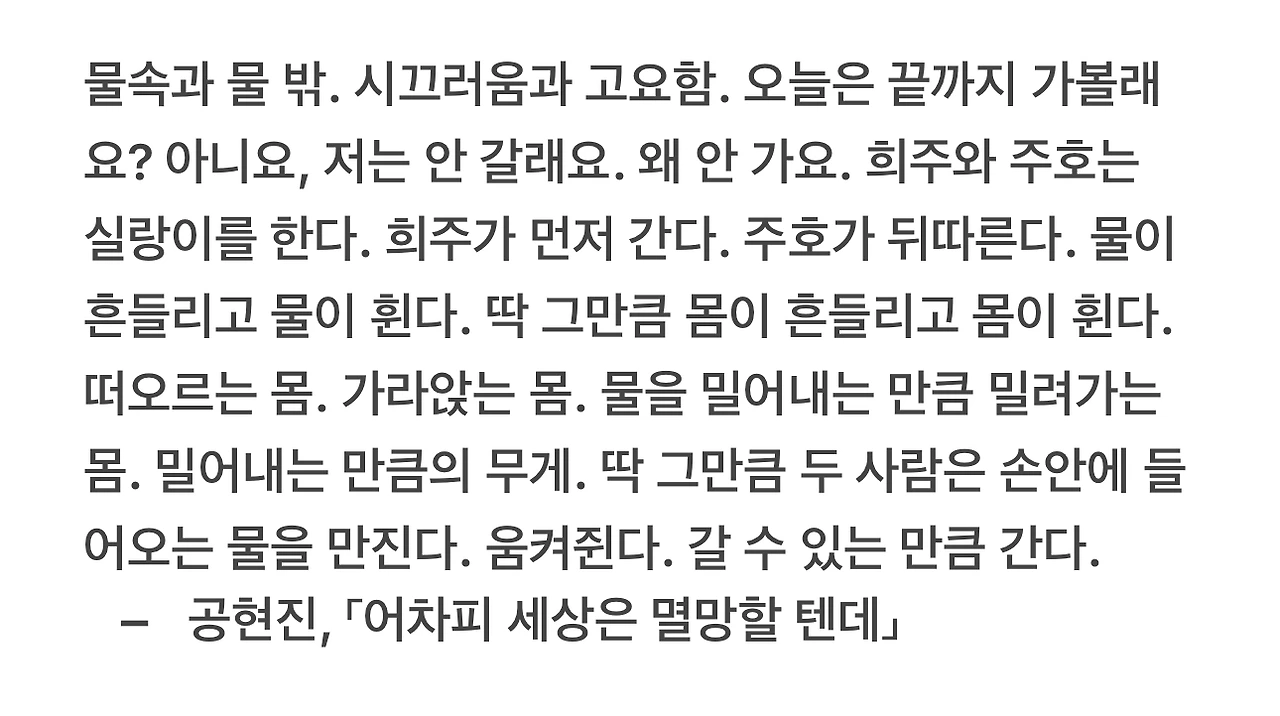 그렇지만 나는 그런 편지를 직접 써서 바다에 실어 보내는 상상을 하곤 했어. 파도가 밀어내는 만큼 밀려지고 당기는 만큼 당겨지다 해변에 도착하는... 모래에 파묻혀서 혹은 몽돌에 끼어서 발신자도 수신자도 서로를 모르고 오 직언젠가 읽히기를 바라는 마음만 담긴 편지.