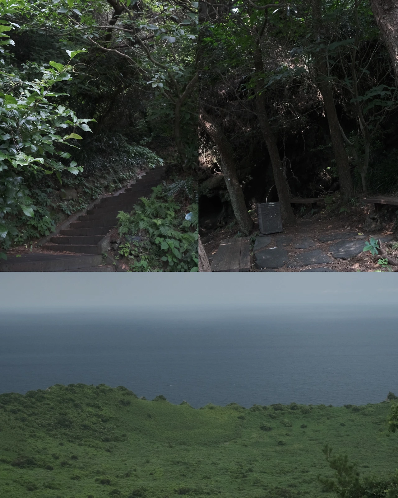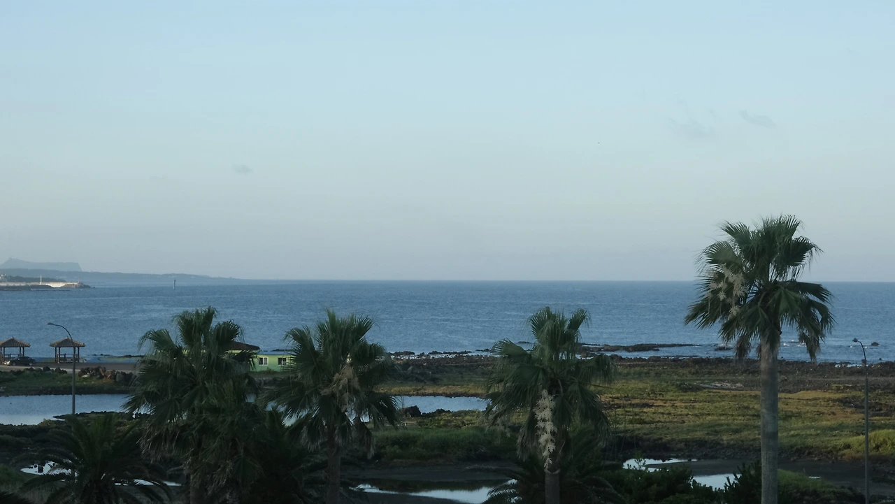낮에 그래도 주변을 둘러보자면서 나섰는데 마침 구름이 끼면서 공기가 약간은 시원해진 때였어. 날이 더우면 사람이 겁도 없어진다고 하더니 나는 금방 해가 나올 줄도 모르고 호기롭게 성산일출봉 등정을 시작했어. 우거진 식물을 둘러싼 습기에 계단이 꼭 끝없이 이어지는 것만 같기도 했어. 절반 지점에서 포기할까 하다가 뭔가 지는 기분에 또 이미 땀으로 흠뻑 젖어 더 잃을 것도 없단 생각에 꿋꿋이 올라갔고, 그렇게 도착한 정상에서 뿌옇게 경계 진 하늘과 바다, 숲처럼 초록으로 울창한 분화구를 보았지. 화산섬이 대개 그렇듯 본섬과는 원래 떨어져 있었다는데 20세기 들어 도로가 놓이면서 연결됐대. 전설 속에서는 제주 할망 거신이 일출봉을 빨래 바구니로 우도를 빨랫돌로 썼다는데, 갓 씻겨 뽀득뽀득해진 옷감들이 분화구 위로 수북이 쌓인 모습을 자꾸 상상하게 됐어. 흰옷이라면 초록 잎에 물들 텐데 싶기도 했고…. 무엇보다 당장 땀에 찌는 옷을 죄다 벗어던져 씻기고 싶기도 했지.