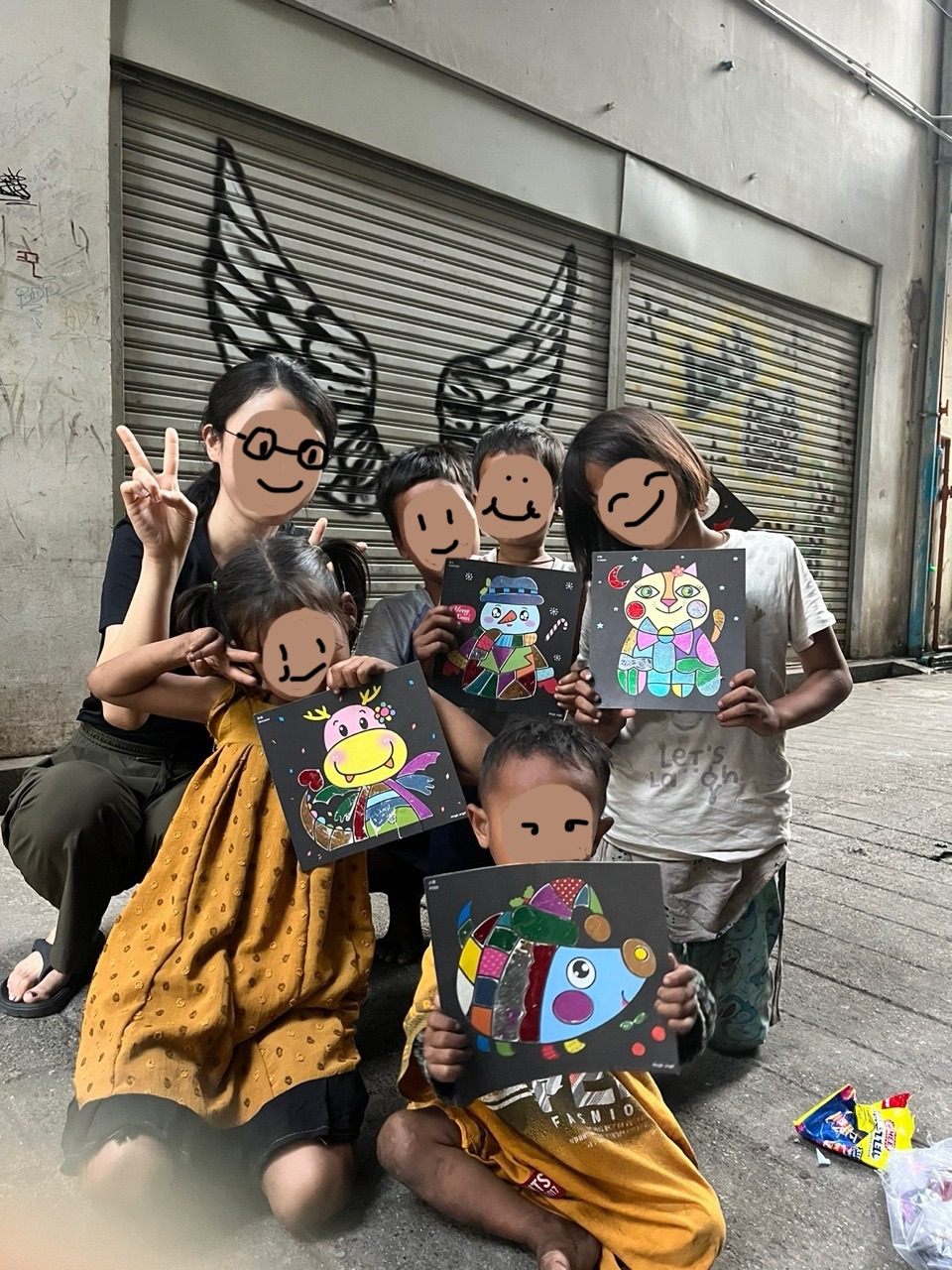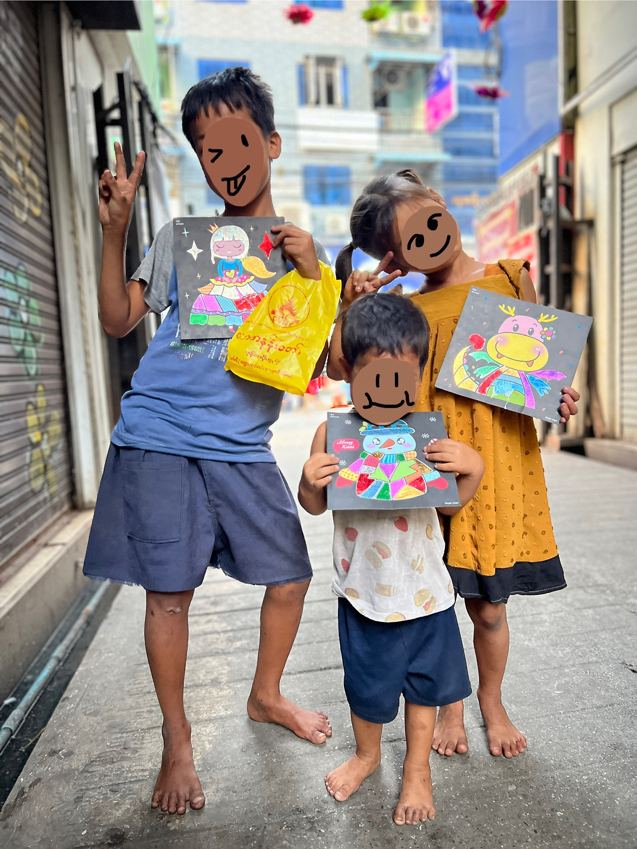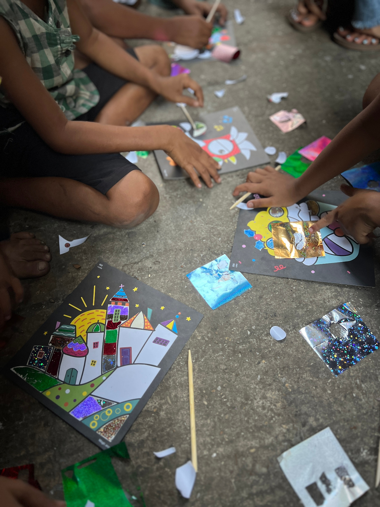 바로 옆에 사람들이 많지 않은 골목이 있어서 자리를 옮겼다. 한국에서 사 온 포일아트 세트를 꺼내 아이들에게 나누어 주었다. 아이들은 도안을 고르며 시작도 전에 폴짝폴짝 뛰어댔다. 어떻게 해야 하는지 알려주니 아이들은 곧잘 했다. 생각보다 잘해서 기특했다. 반짝이는 포일을 끈적거리는 곳에 붙였다가 떼어낼 때마다 아이들은 활짝 웃으며 좋아했다. 우리에게 이것 좀 보라며 계속 부르고, 급한 마음에 스티커가 안 떼어진다며 떼어달라, 무슨 색이 없다며 더 달라 정신이 없었다.