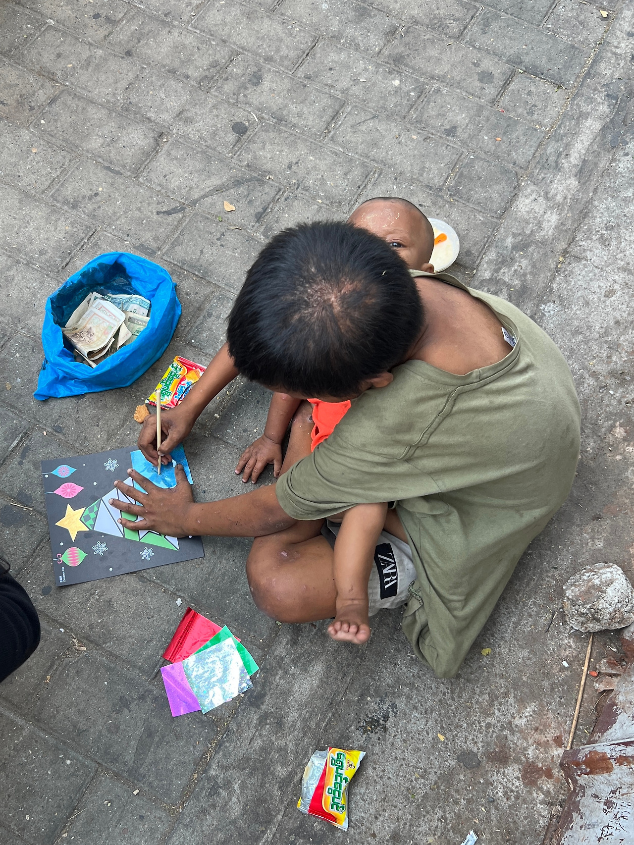 다른 곳으로 아이들을 찾아 헤매었다. 여기 아이들이 많았는데 요즘 왜 이렇게 찾기가 어려운지 모르겠다. 레단에서 봤던 아이를 여기서도 보는 걸 보면 순환 근무를 하는 건가 순환 노숙을 하는 건가 싶기도 하다. 어렵게 아이 두 명을 찾았다. 아이들은 나무 덤불을 발로 차며 놀다가 사람들이 지나가면 다가가서 손을 내밀고 음식이든 돈이든 달라고 조르고 있었다. 아이들을 불렀다. 이미 우리를 알고 있었다. 저번에 스티커를 붙여줬었다며 아는 체를 하더니 간식을 달라고 한다. 간식은 없고 놀 거리가 있다며 보여주자 아이들은 급 흥분해서 소리를 지르며 다른 아이들을 불러 모았다. 우리 눈에는 보이지 않았던 아이들이 여기저기에서 모였다.