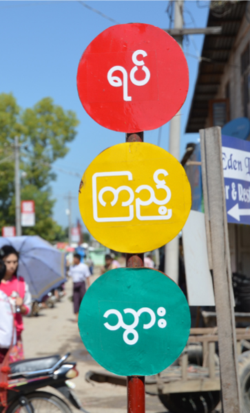미얀마에서 횡단보도를 보기란 하늘의 별따기다. 그나마 대도시인 양곤에는 도로에 횡단보도 흰 줄이 그어져 있는 곳들이 몇 있지만, 신호등을 보기는 역시나 어렵다. 길을 건널 신호등을 찾겠다고 주위를 둘러보지 않아도 된다. 다운타운 쪽에서 한 두 개 빼곤 본 적이 없다. 신호등 색의 표지판은 종종 볼 수 있는데, 차를 위한 신호등에 이런 의미가 있으니 보행자는 알아서 잘 생각해서 다니라는 뜻인가 싶다.