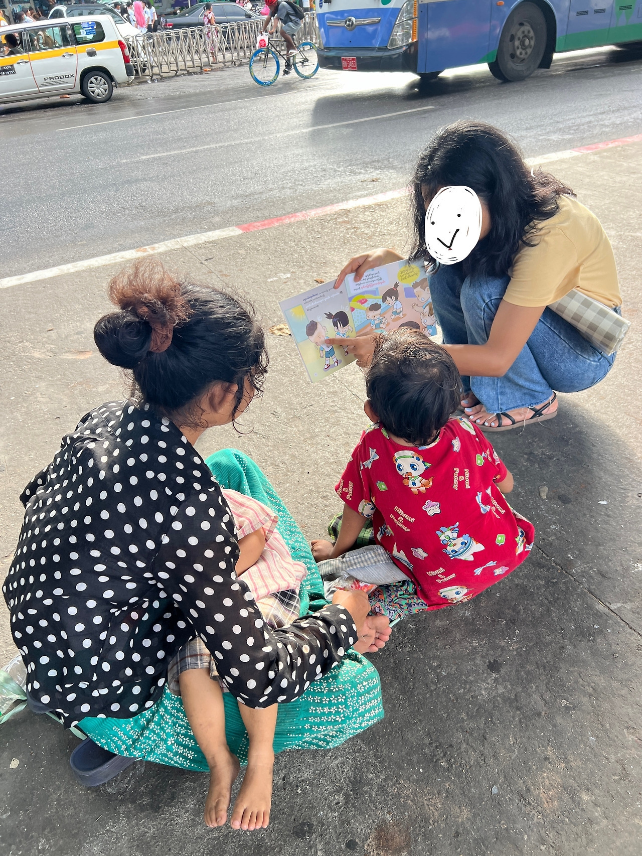 아무래도 두 성인 여자가(그것도 한 명은 외국인이) 아이들에게 바로 다가가서 뭔가를 읽어주겠다 하는 것은 수상해 보이려나 싶어서 작전을 변경했다. 옆에 있는 어른에게 말을 거는 것으로! 쟤네는 뭘 하는 건가 싶었는지 우리를 구경하던 구걸하는 아주머니께 ‘제가 미얀마어를 공부하고 있는데 책을 잘 읽는지 들어봐 줄 수 있어요?’ 여쭈니 관심을 가지셨다. 그 얘기를 듣던 다른 아주머니가 자기 아들에게 ‘가서 들어봐!’ 했다.