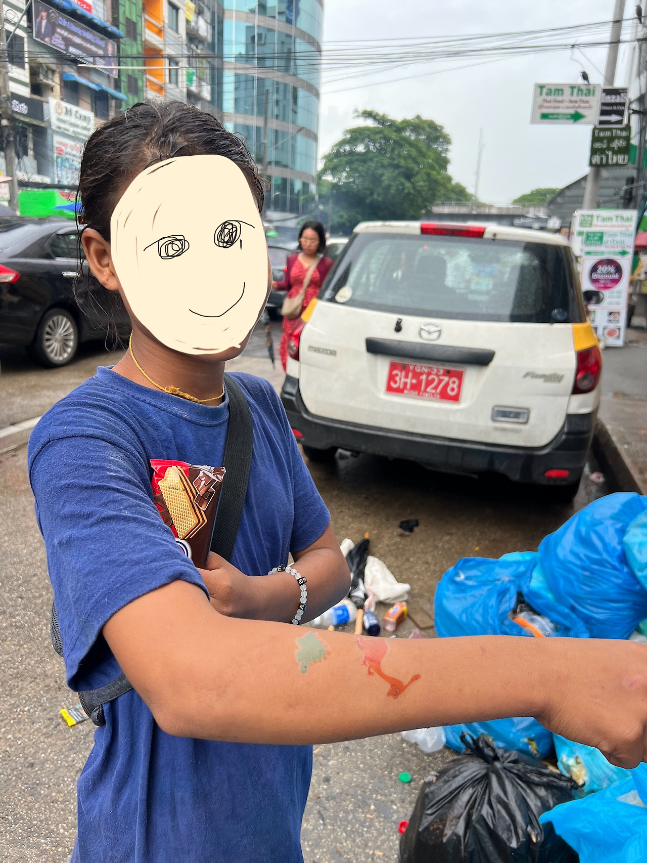 큰길로 나왔다. 건너편 파란색 쓰레기봉투가 가득 쌓여 있는 곳에 파란색 옷을 입은 여자 아이가 쭈그려 앉아 바쁘게 손을 움직이고 있었다. 쓰레기 더미에서 쓸만한 것들을 찾아 파는 일을 하나보다. 다니다 보면 이런 쓰레기 더미가 쌓여 있는 곳마다 한 명씩 자리 잡고 쓰레기 뒤지는 모습을 쉽게 볼 수 있다. 아이에게 가서 말을 걸었다. 무표정한 얼굴로 우리를 쳐다보더니 스티커를 보고 관심을 가졌다.