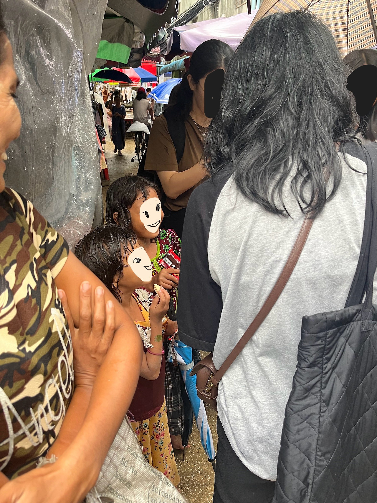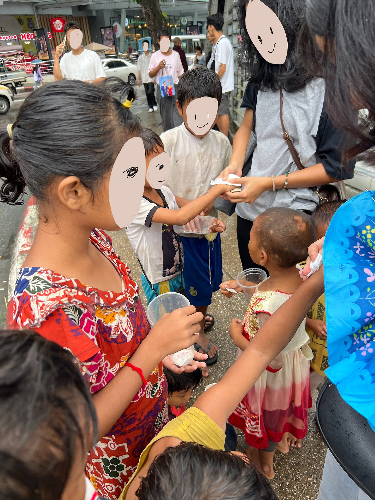'우리 기억하지?' 물으며 ‘스티커 붙여줄까?’ 물으니 고개를 끄덕이며 또 한 번 웃는다. 비가 좀 잦아들었다. 그래도 아직은 부슬부슬 내리는 비에 나는 우산 없이 비를 맞고 있는 것이 무척 어색하고 불편하지만 이 흠뻑 젖은 아이 앞에서 고상 떨며 우산을 쓰고 있기 미안했다. 우산을 접고 쭈그려 앉아 스티커를 고르게 하고 붙여줬다. 멀리서 몇몇 아이들이 우리를 보고 뛰어 왔다. 저번에 만났던 아이들이다. 이제는 아이들이 먼저 다가온다. 한두 번 봤는데도 이리 반겨주니 고마울 따름이다.