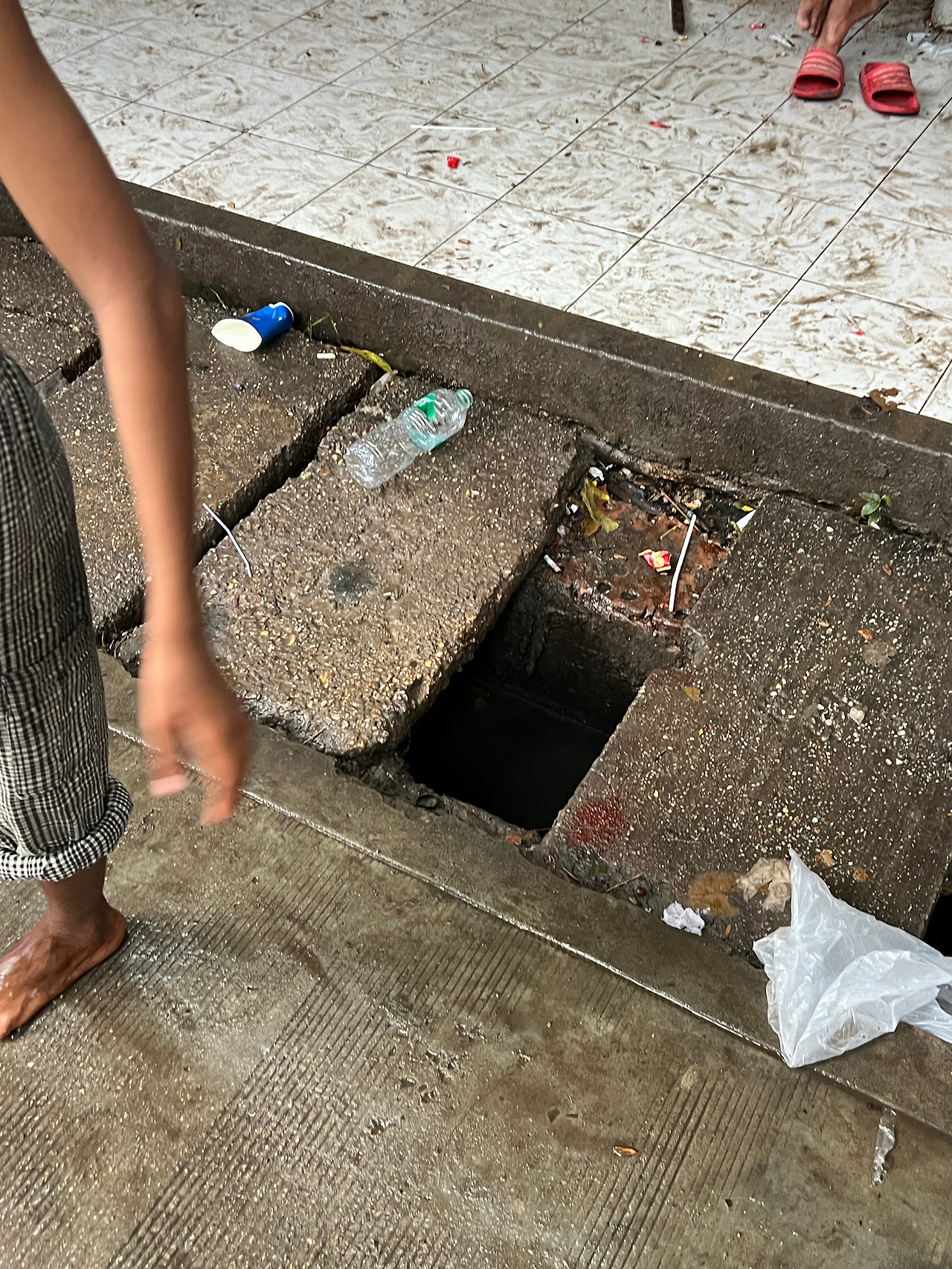 이 하수도 앞에 쭈그려 앉아 저 아래 있는 물로 손을 닦는 모습을 봤기 때문이다. E도 망설이고 나도 망설였다. 이걸 몰랐으면 모르는 거지만 내 눈으로 목격한 후에 그 손을 잡고 스티커를 붙여주고 뭔가를 한다는 것이 도무지 내키지 않았다. 물론 오늘 만난 대부분의 아이들의 손이 이보다 더러울 수도 있지만 아무튼 이런 장면을 직접 목격하고 나니 도무지 못하겠었다.