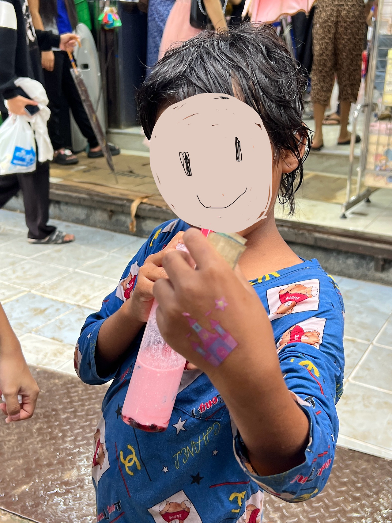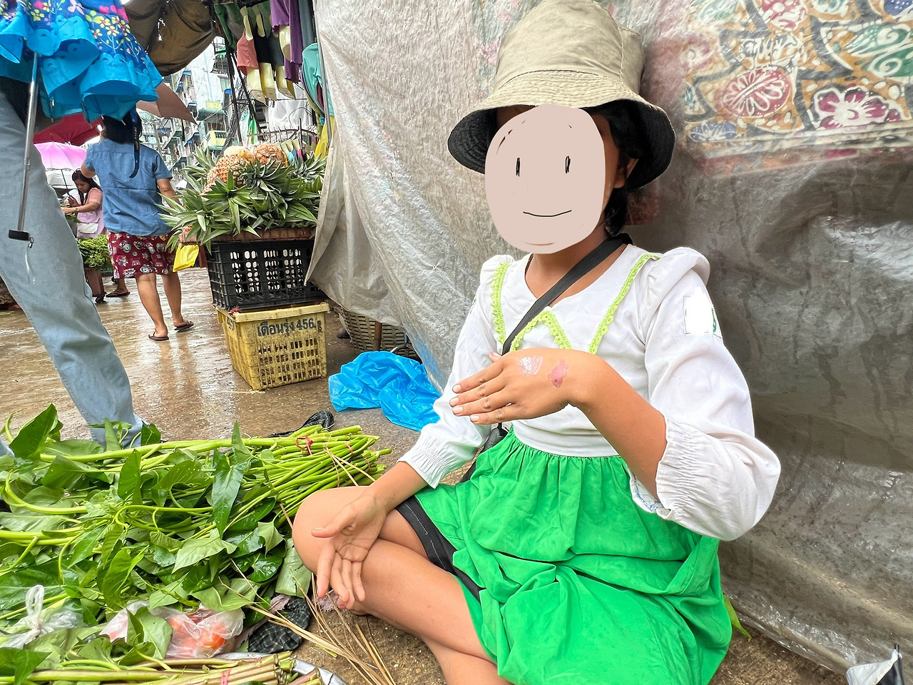아이에게도 다가가 스티커를 붙여줬다. 책을 읽어주기에는 장사를 하고 있는 아이라 방해가 되는 것 같았다. 붙여주는 동안 잠시 이야기를 나누었는데 학교에 다녀온 뒤 바로 야채를 싸들고 여기에 나왔다고 한다. ㅅㅂㄷ에 사는 아이였는데 ㄹㄷ에서 1시간 반 정도 걸려서 왔다고 했다. ㄹㄷ이 사람이 많이 모이는 곳이어서 여기까지 왔나 보다. 2시에 학교가 끝나면 한 시간 반 동안 홀로 시장에 나와 길바닥에 앉아 야채를 팔고 6시쯤 돌아간단다. 매일 나오는 건 아니라고 하는데 다른 지역에도 돌아다니는 건지 어쩌다 이렇게 장사를 하러 나오는 건지는 모르겠다.