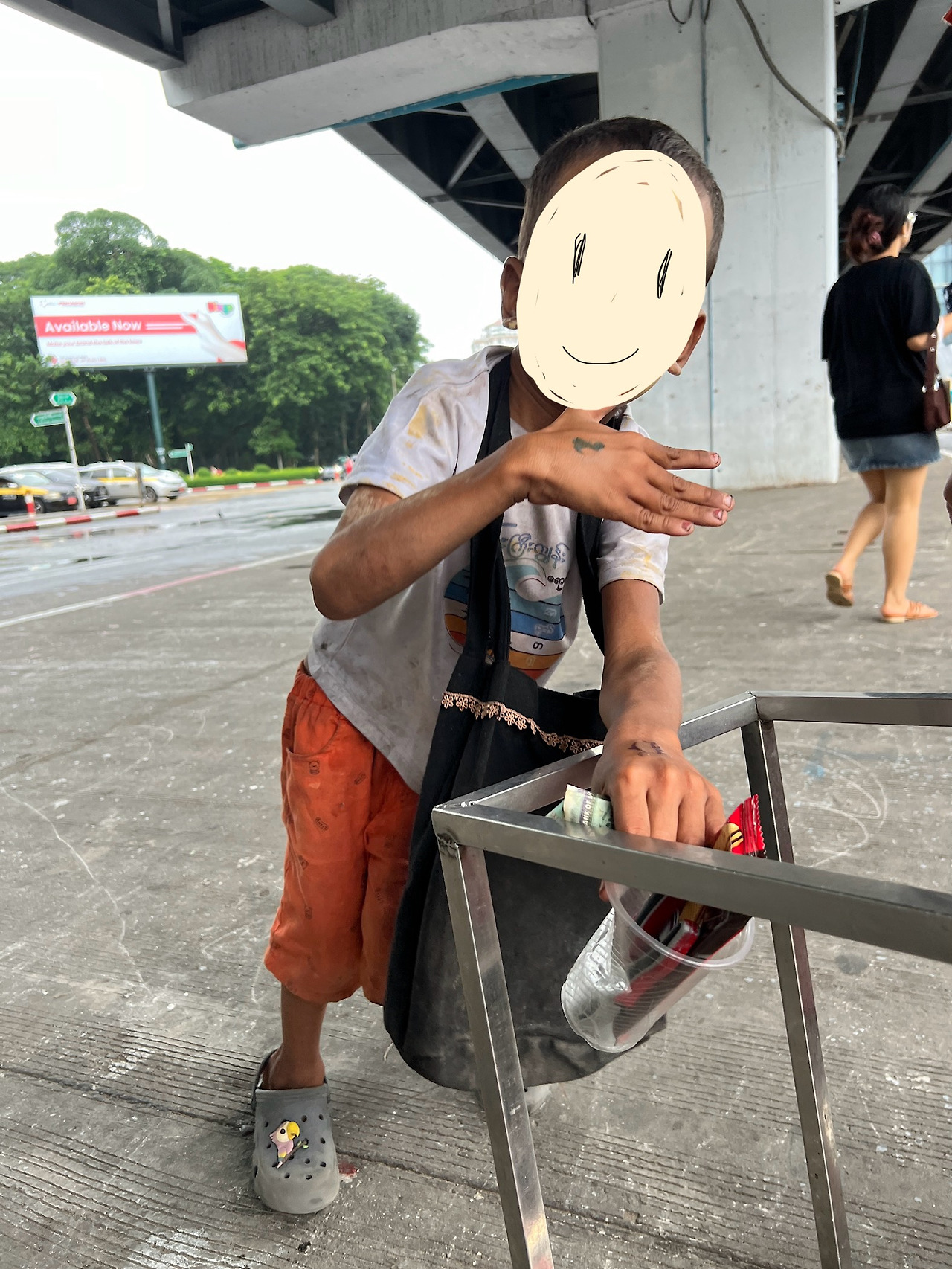 비가 오니 지붕이 있는 곳에 아이들이 모이지 않을까 싶어 고가도로 아래로 갔다. 아까 처음에 만났던 아이들이 빨간불에 멈춰 선 차들 사이를 다니며 구걸하고 있었다.