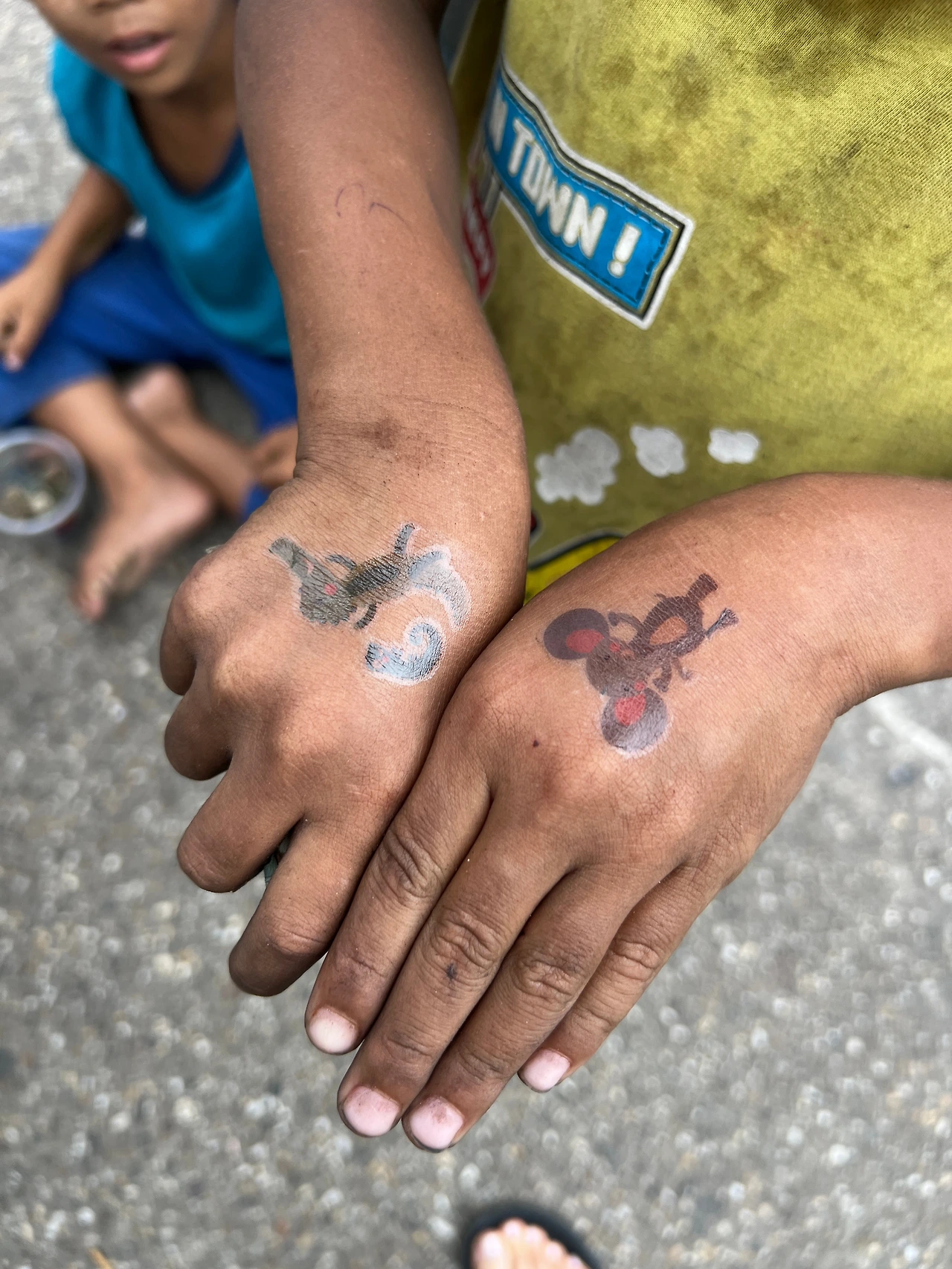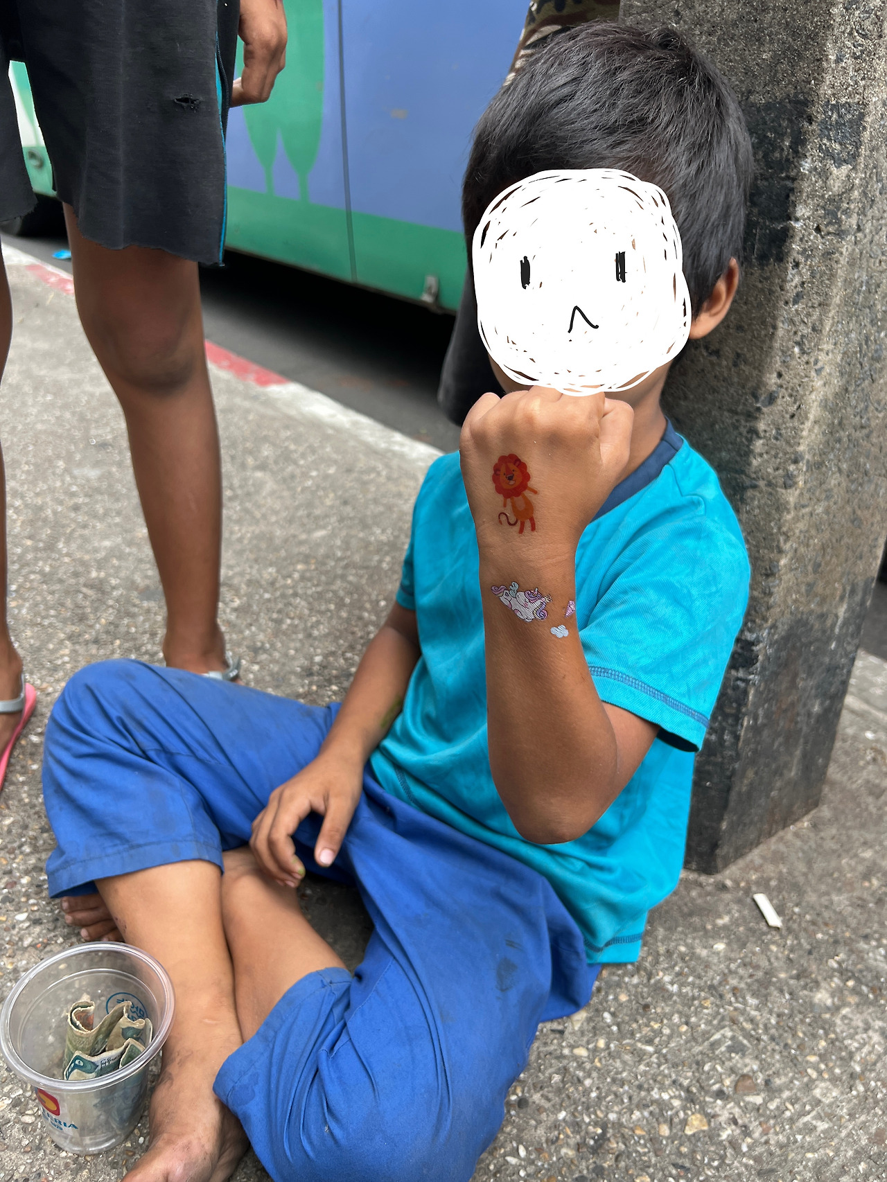 놓칠세라 옆에 온 두 명의 아이들에게 '너희도 붙여줄까?' 물었다. 당연히 고개를 끄덕끄덕. 기다렸다는 듯이 스티커를 고르기 시작했다. 한 명은 알고 보니 앉아서 구걸하던 아이의 동생이었다. 이 아이는 형과 다르게 리액션이 좋았다. 표정도 귀염지게 살아 있었다.