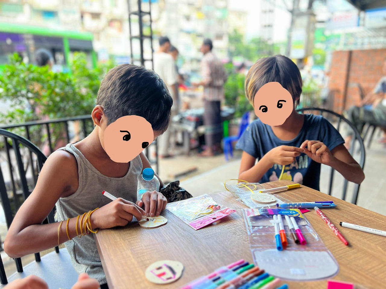 현장에서 하지 않고 줘버리면 다른 아이들도 집에 누가 있다, 저기에 친구가 있다 하면서 나도 달라 외치고, 팔아먹거나 빼앗길 수 있기 때문에 그렇게는 주지 않는 것이 나름의 원칙이다. 하지만 이 아이에게는 몰래 하나 쥐어 주었다. 정말 하고 싶어 보였고, 집에 색칠할 수 있는 도구가 있다고 했기 때문이다. 아이는 밝게 웃으며 정말 소중히 품 속에 숨겨 가지고 갔다.