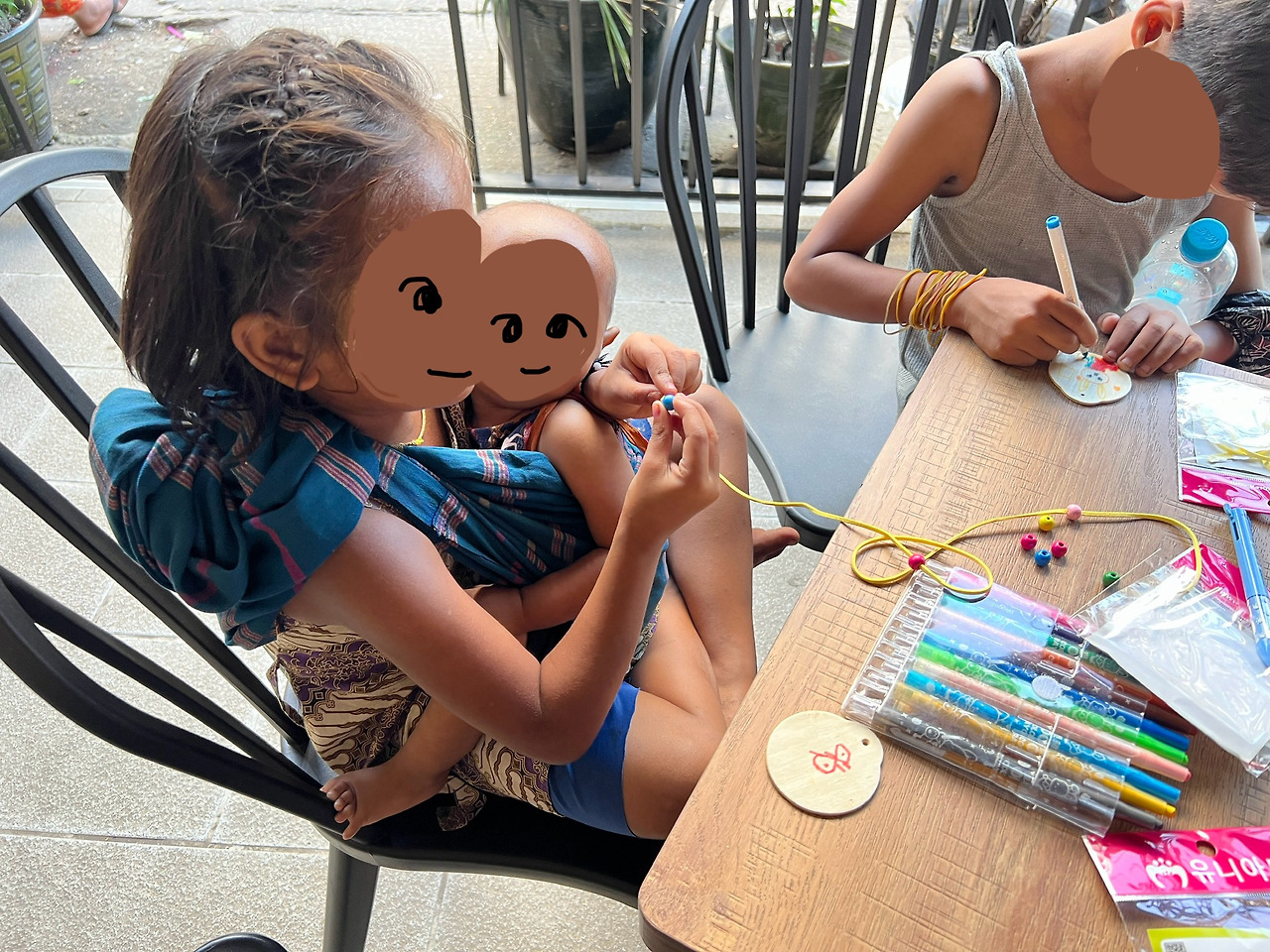 가져온 목걸이 만들기 세트를 보여주자 엄청나게 관심을 보였다. 남자아이 세 명이 있었는데 지나가던 여자 아이 한 명이 더 합류했다. 테이블 하나에 의자를 더 가져와 네 명이 앉을 수 있도록 배치했다.