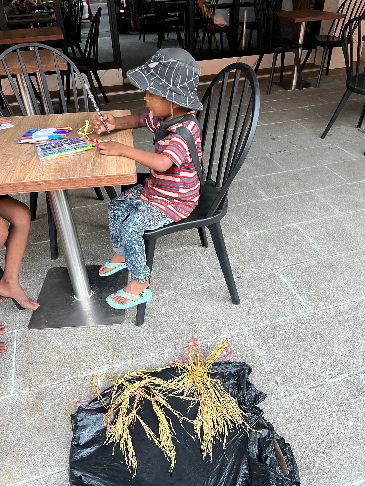 10대 중반 정도 되어 보이는 여자 아이가 아주 작은 아기를 안고 이삭 묶음이 있는 광주리를 이고 지나가다 우리를 보았다. 색칠하고 있는 아이와 한 무리 같았다. 다가와서 아이에게 "너 여기 있었네"하길래 "너도 할래?" 물으니 아주 미련 가득한 표정으로 "아니요"라고 했다. 이들이 같은 앵벌이 그룹에 속해 있는 것 같다는 생각이 들었다. 그렇게 거절을 하고 잠시 자리를 떴다가 다시 돌아와 계속 우리 주위를 맴돌았다. 새것이 있으니 하고 가도 된다고 했지만 아이는 누군가 눈치를 보는 것 같았다. 조용히 다가오더니 집에 가서 하고 싶다고 하나만 줄 수 있냐고 물었다.