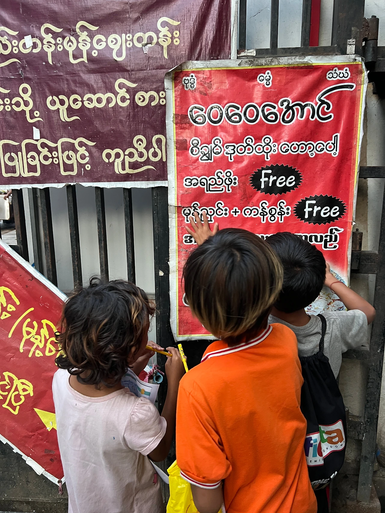 아이들에게 오늘 왜 돈을 벌어야 하냐고 물었다. 지금까지 봐왔을 때 이 아이들은 조직에 속해 있지 않는다고 생각했기 때문이다. 아웅의 친구가 할머니 병원비 때문에 오늘 만짯을 벌어야 한다고 대답했다. 아웅에게 너는? 하고 물으니 우물쭈물하며 자기도 할머니 병원비를 벌어야 한단다. 같은 할머니냐고 물었더니 그건 아니라면서 계속 우물쭈물 댄다.