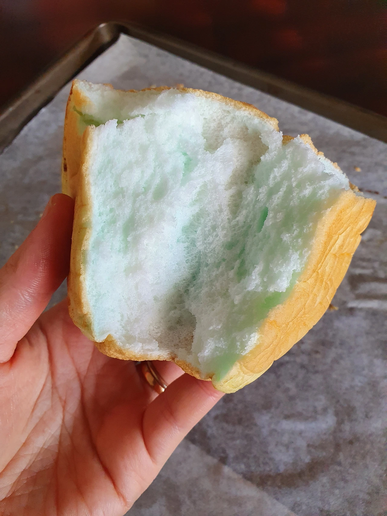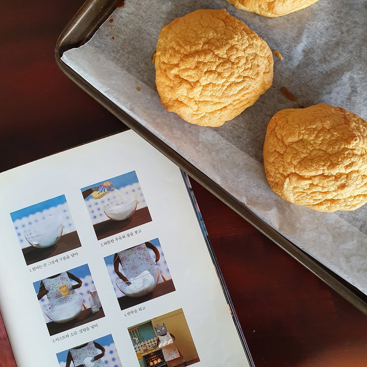 오븐으로 후다닥 아이가 달려간다. 꺼내자마자 빵빵하게 부풀어 오른 빵이 정말 한가득 구름 같았는데, 머랭의 특성상 이내 바깥이 쭈글쭈글 해진다. 그래도 밖에서 찌르면 폭신폭신 들어가는 빵이 신기해 남편도 나도 이리 찔러보고, 저리 찔러본다.