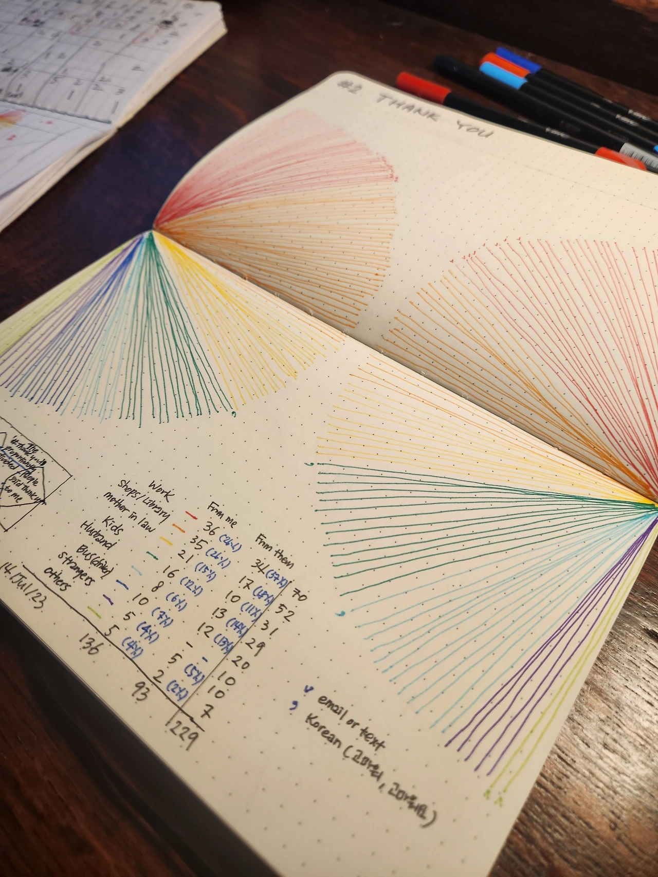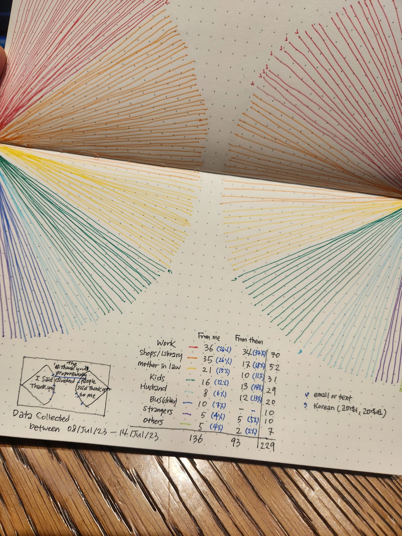 지난주 토요일부터 이번주 금요일까지 한 주 동안 총 229번의 표현이 오갔고, 그중 136번(59%)이 내가 한 경우, 93번(41%)이 상대가 한 경우이다. 부채의 사이즈를 상대가 말한 경우인 오른쪽을 더 적게 하여 선의 촘촘함(proportion과 density)이 제대로 드러나게 할 수도 있지만, 나와 타인 중 누가 더 많이 말하고 들었는지의 비교에 목적이 있는 것이 아니라, 각각의 경우에 몇%로 누군가에게 가장 많이 말했고, 가장 많이 들었는가를 보는 것이므로 평화롭게 동일한 크기의 무지개 부채로 정했다.
