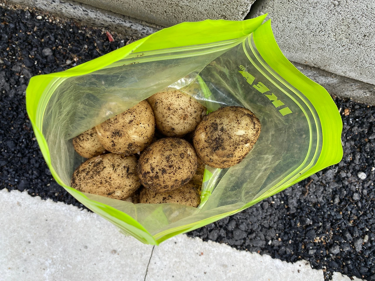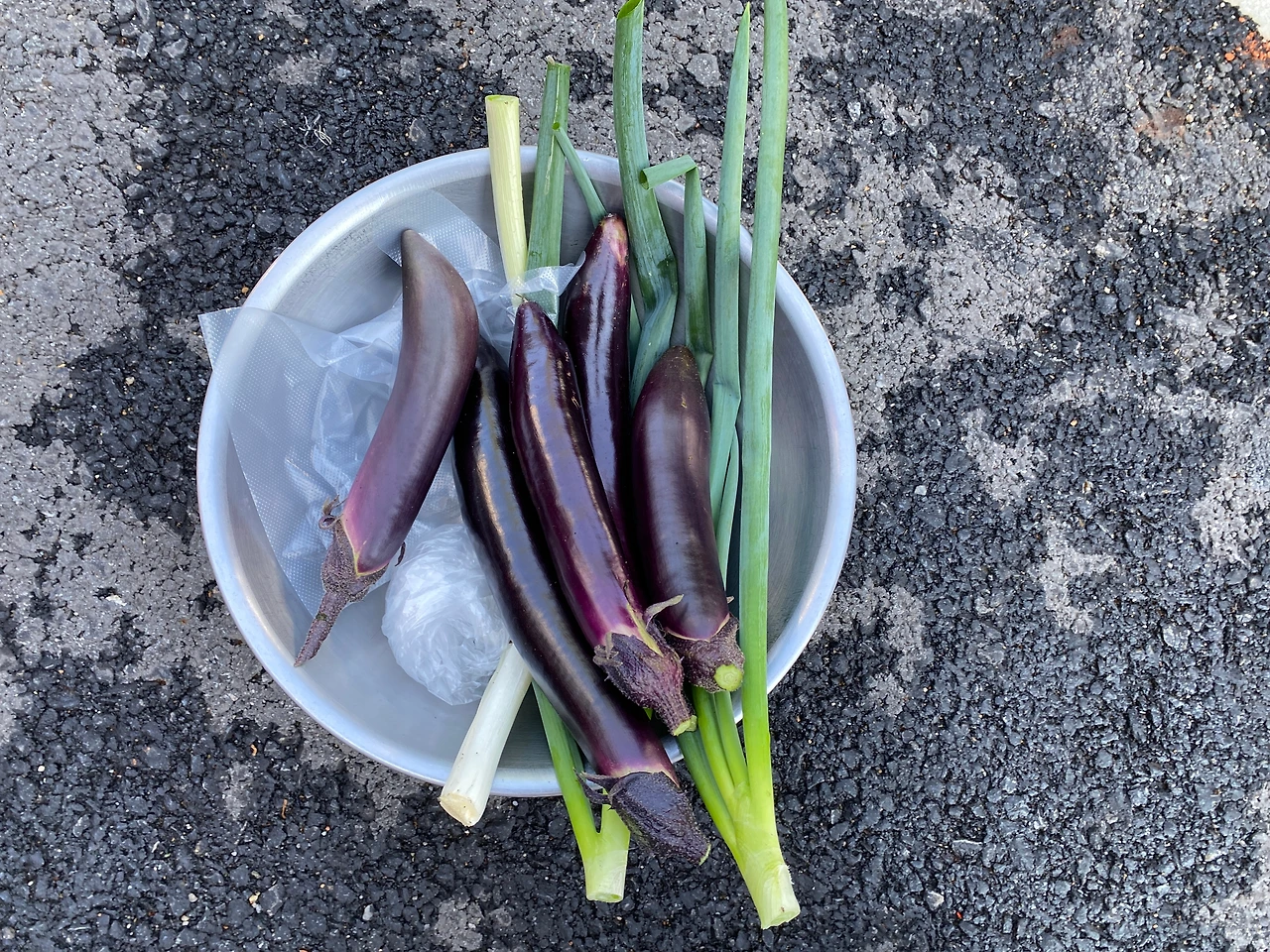 도착하자마자 만들어간 샌드위치를 건네고 엄마가 해준 고추장 불고기를 밭(?)에서 딴 여리고 야들야들한 상추를 겹겹이 싸 와구와구 먹었다. 사무실 바닥에 돗자리를 넓게 펴고 놀다가 해가 좀 넘어갈 쯤에 호미, 가위, 비닐백을 챙겨 밭으로 갔다. 감자 싹을 쑤욱 뽑아내고 흙을 호미로 슬슬 긁어내니 뽀얀 감자가 여기저기서 얼굴을 내밀었다. 다 나왔다 싶다가도 호미질을 몇 번 더 하니 또 나오고 또 나오는 감자를 보는 아이의 얼굴엔 기쁨이 가득했다. 유치원 때 해본 체험과는 달리 선생님이 하지도 않고 자기 혼자 다 하니 너무 좋다고 했다. 한 평도 안 되는 땅에서 감자가 비닐팩 한가득 나오자 아빠도 함박웃음을 지으며 내년엔 다른 땅에도 감자만 심어야겠다 하시며, “아 감자 진짜 많이 나오네~ 생각보다 많이 나왔네~”를 반복하여 말씀하셨다. 가지와 고추도 가위로 자르고, 대파도 한 뿌리 뽑았더니 장본 것처럼 묵직해졌다.