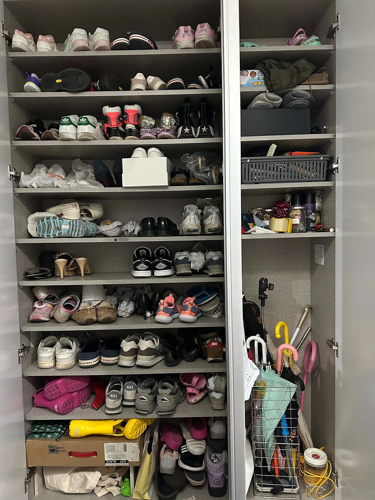 친구들 아이들의 발 사이즈를 물어 물려줄 만한 것들을 솎아내고 물려줄 사람이 없거나 둘째가 신는 게 더 빠를 것 같은 신발들은 하나하나 제습제를 넣어 봉하고 사이즈를 표기해 둔 뒤 튼튼한 쇼핑백에 담아 신발장에 넣었다. 신발을 정리한 김에 우산과 현관에 두고 쓰는 마스크, 실내화도 정리했다. 아, 가지런하고 예뻐라.
