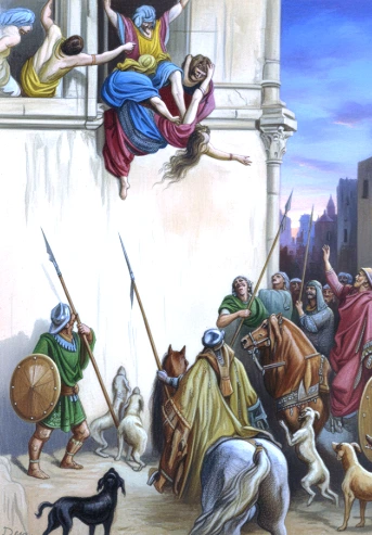 이세벨은 창 밖으로 내던져진 후 말에 짓밟혔으며, 그녀의 시체는 개들이 먹어버렸다.