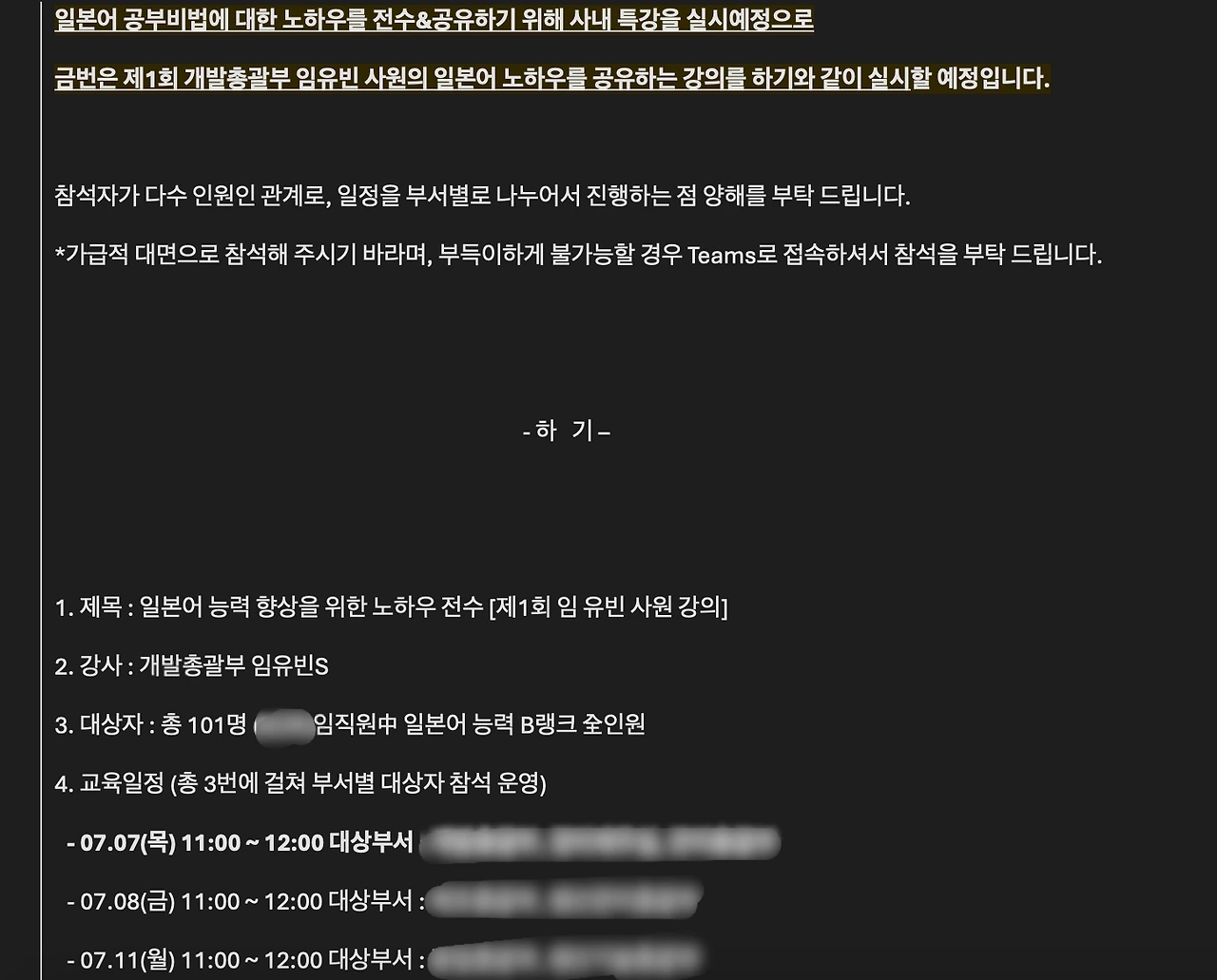 한국 지사 전체 메일로 픽스된 일정이 내려왔고, 총 100명 정도의 대상 분들을 부서 별로 나누어, 1시간씩 3일 간 강연을 진행하였다.