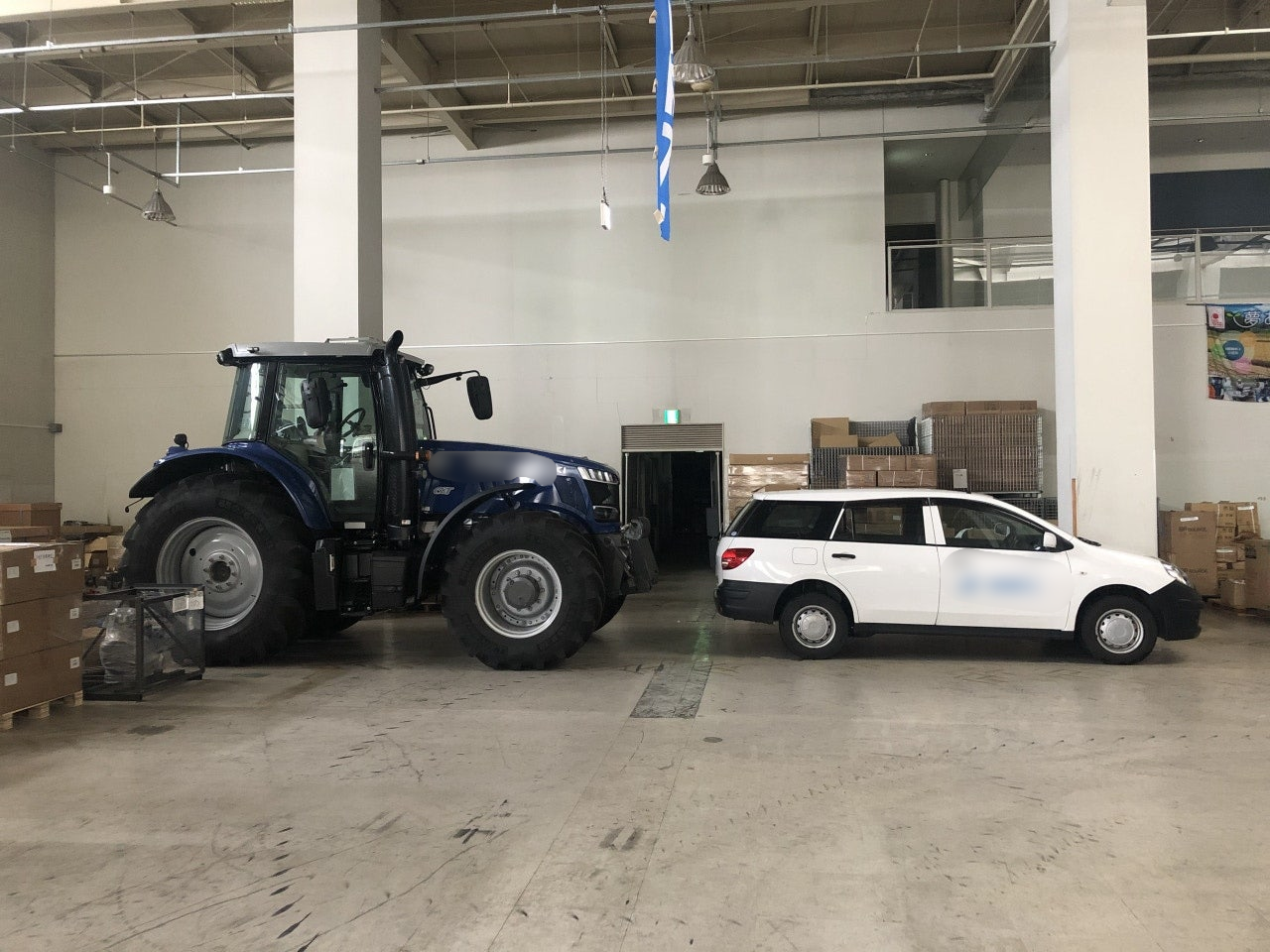 회사 전시장 창고 내부에서 찍었던 사진 (회사 차와 비교해보면 트랙터 크기가 정말 크다는 것을 느낄 수 있다.)