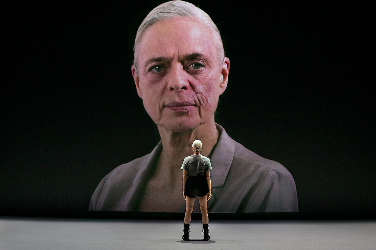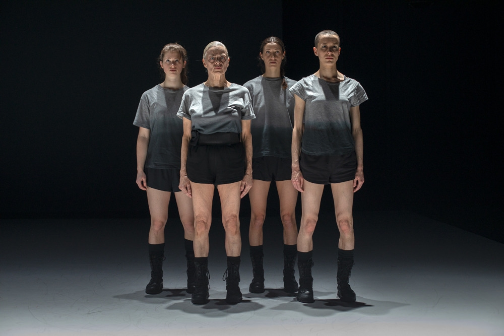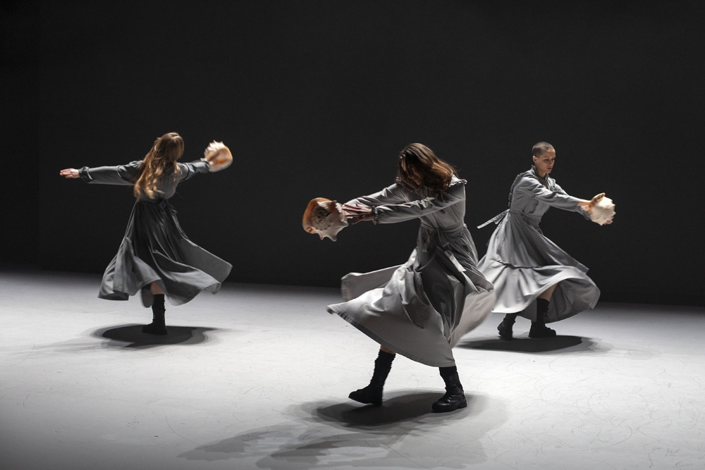 극은 암전 가운데 지도자의 죽음으로부터 시작한다. 애도하던 소녀들은 회색 옷을 입고 원 안을 맴돌다 밖으로 나오고, 곧 여성으로서 성적 정체성을 발견하고 즐기며, 복수를 위한 훈련을 받고 전사로 거듭난다. “여성에 대한 표현이 만화경처럼 펼쳐지며” “공상 과학과 역사적 재구성이 번갈아 나온다”는 연출 노트에 비해 실제 연출은 ‘소라’로 여성성을 상징하거나 전쟁을 피 묻은 카펫 위의 격렬한 안무로 구성하는 등 신선하지는 않았다. 그러나 에코페미니스트 스타호크(Starhawk, 1951~)의 ‘나선무’를 차용하거나, 스크린 속 커다란 등장인물의 얼굴이 스스로를 지켜보는 주체이자 감시자로서 모호하면서도 엄격한 분위기를 조성하는 등 몇몇 방식은 흥미로웠다.