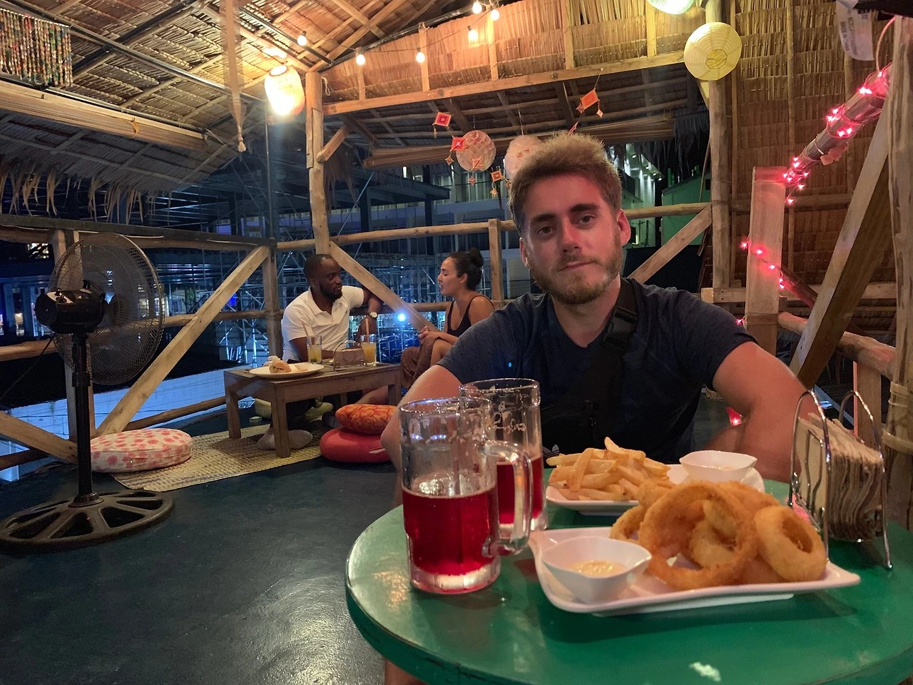 그러나 좋은 기분도 잠시. 현지 물가에 너무 익숙해진 탓일까? 어제만 해도 레드 호스 한 병에 밥을 120페소에 먹었는데, 여긴 감자튀김 하나에 120페소 한다. 엘 니도는 무엇이든 비싸구나. 여기선 관광객 모드로 살아야 하나 보다. 어니언 링과 감자튀김 그리고 시럽 넣은 맥주를 두 잔 시킨다. 건너편으론 오늘 만난 듯한 남녀가 맥주잔을 기울이며 호감 어린 눈으로 서로의 이야기를 듣는다. 낯선 여행지에서 만난 운명. 설레는 기분. 얼마나 좋을까. 한참을 쳐다보다가 니콜라스가 꺼낸 보트 이야기에 현실로 돌아온다.