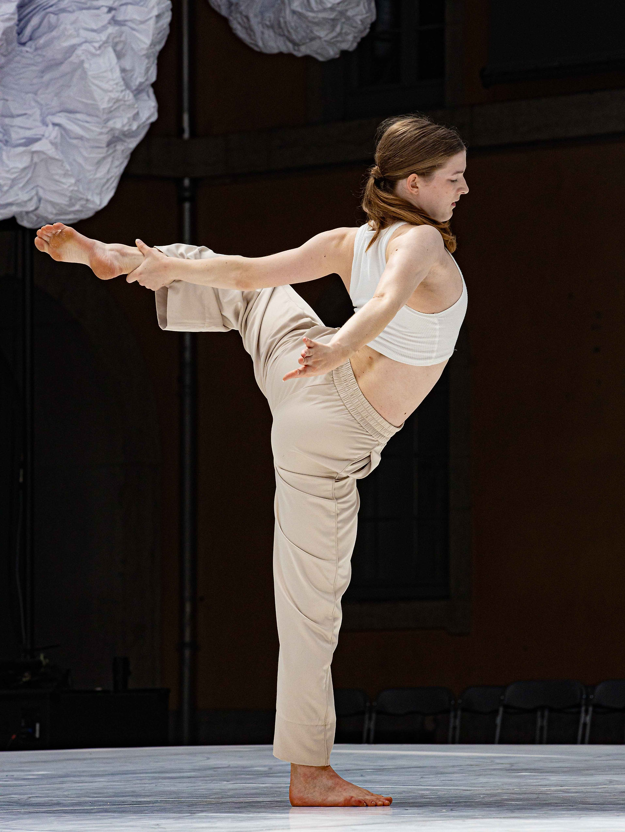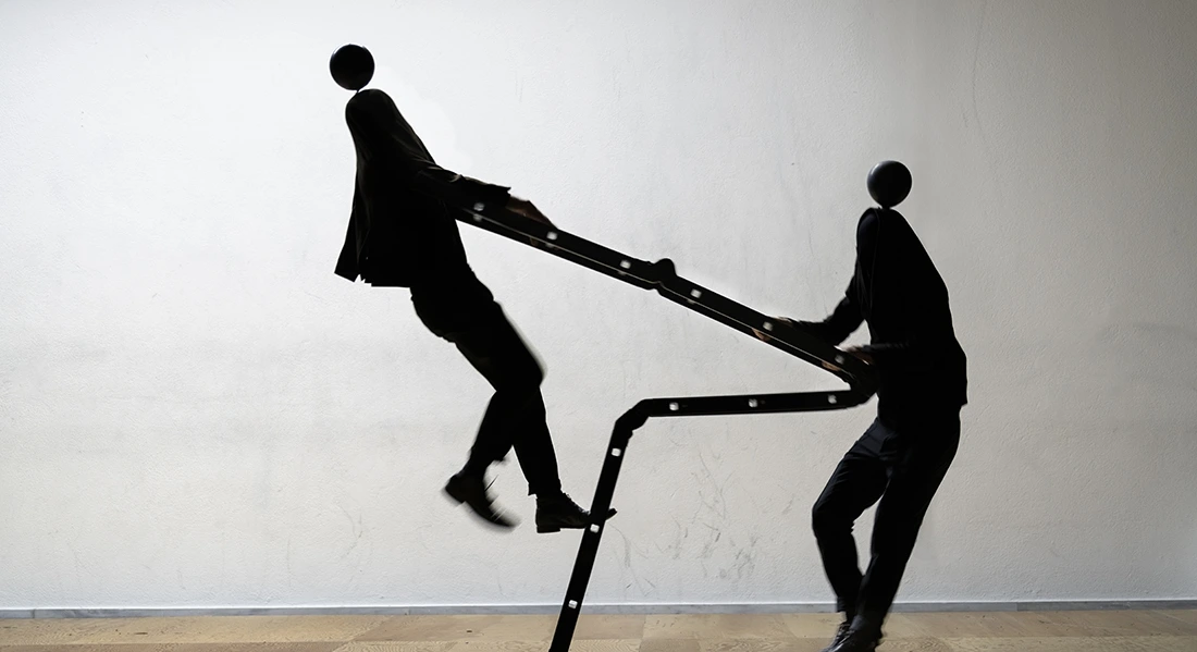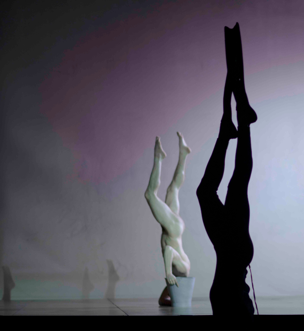 작품은 검은 무대 대신 흰 벽을 세워 무용수들의 움직임을 실루엣처럼 사용했다. 마치 커다란 캔버스에 점들이 번지고 튀어나가듯, 수트를 입은 무용수들은 한 폭의 그림처럼 장면을 구성한다. 이는 검은 무대 위 조명을 받는 무용수들의 ‘동작’에만 빠져들지 않게끔, 다시 말해 어떤 북유럽 신화나 카라바조(Caravaggio)의 그림처럼 어둠이 주는 신비감에 휩싸이지 않도록, 전체적인 ‘장면’을 볼 수 있도록 한 것이라 짐작된다.