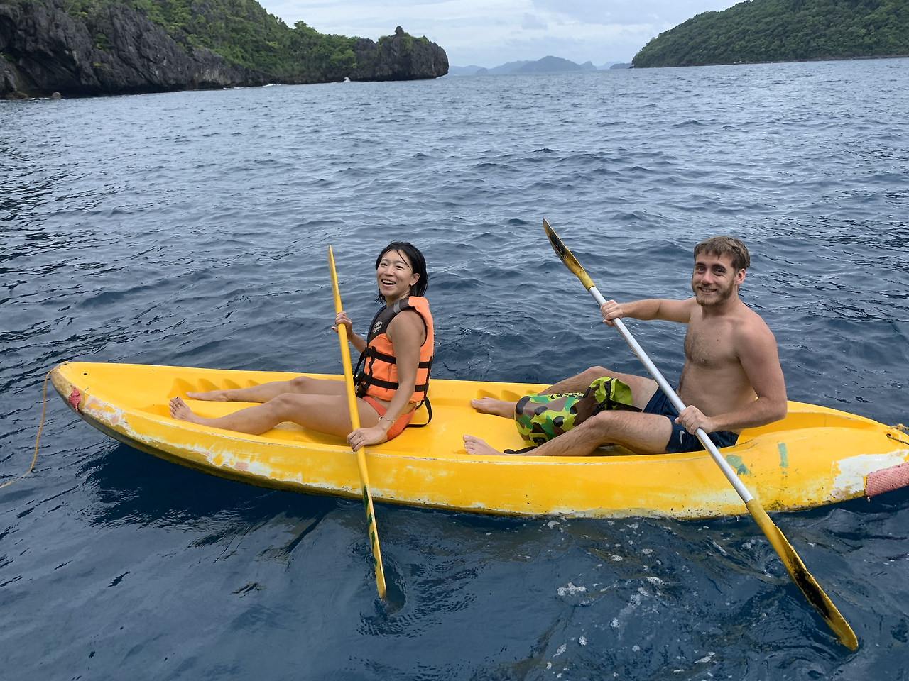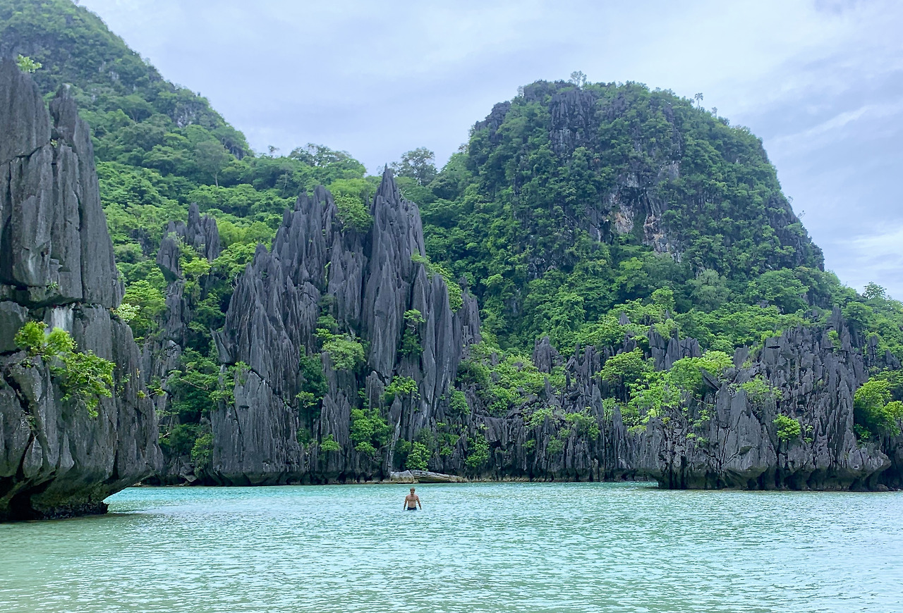 엘 니도는 라군으로 유명하다. 빅 라군, 스몰 라군, 시크릿 라군... 제각각 이름 붙은 라군들은 석회암이 둘러싼 천혜의 수영장들이다. 산화된 산호들이 물과 섞여 오묘한 에메랄드빛을 내는 얕은 바다. 그러나 이미 너무 많은 관광객들이 방문하는 바람에 마냥 깨끗하지만은 않고 때론 들어가기 위해 조그만 바위 입구 앞에 줄을 서서 기다리기도 한다고. 우리가 갈 곳은 트라이시클 아저씨가 추천한 카들라오 라군. 오늘은 아무도 없을 테니 전혀 걱정이 없다. 모터 배는 안에 들어갈 수 없어서 수영을 해서 들어가거나, 카약을 빌려야 한다. 니콜라스는 수영해 가자 했지만 사실 사진을 찍고 싶은 나는 꼭 가방을 가지고 가야 한다. 미안해. 400페소를 내고 카약을 빌린다. 짙푸른 바다가 석회 바위를 지나니 금세 에메랄드 빛으로 변한다. 몇 사람이 스노클링을 즐기고 있다. 안쪽 모래톱에 카약을 대고 늦은 점심을 먹는다. 바위가 둘러싸 파도도 없고 물은 너무나도 따뜻하다.