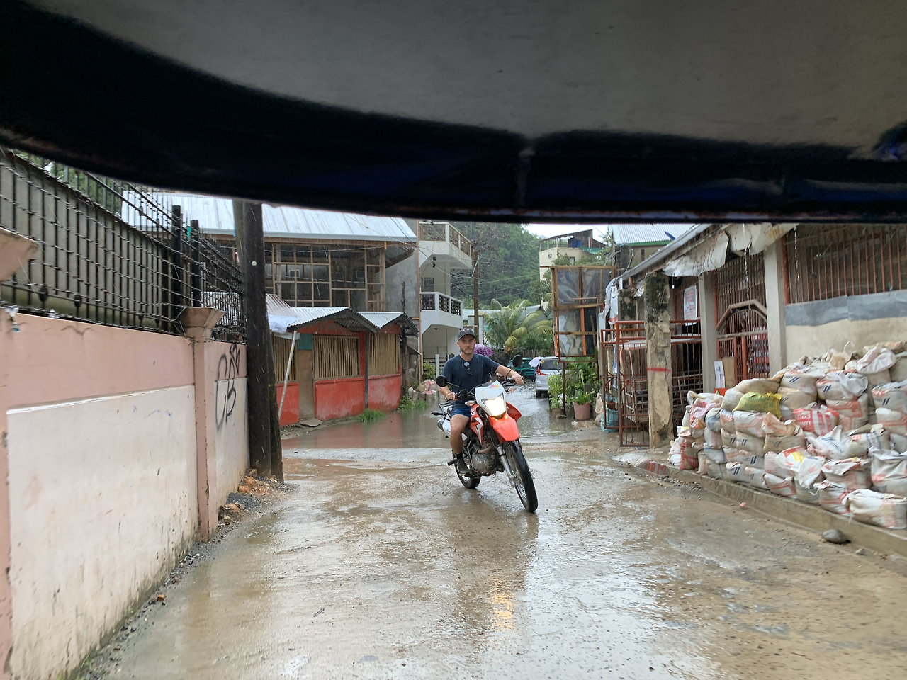 아저씨는 일찌감치 나와 있었다. 보트는 자기 집 앞에 정박해 있다며. 비바람에 모터바이크를 세워둘 수 없어 아저씨 집에 주차하기로 한다. 나는 트라이시클을 타고, 니콜라스는 물에 젖은 생쥐처럼 트라이시클을 따라온다.