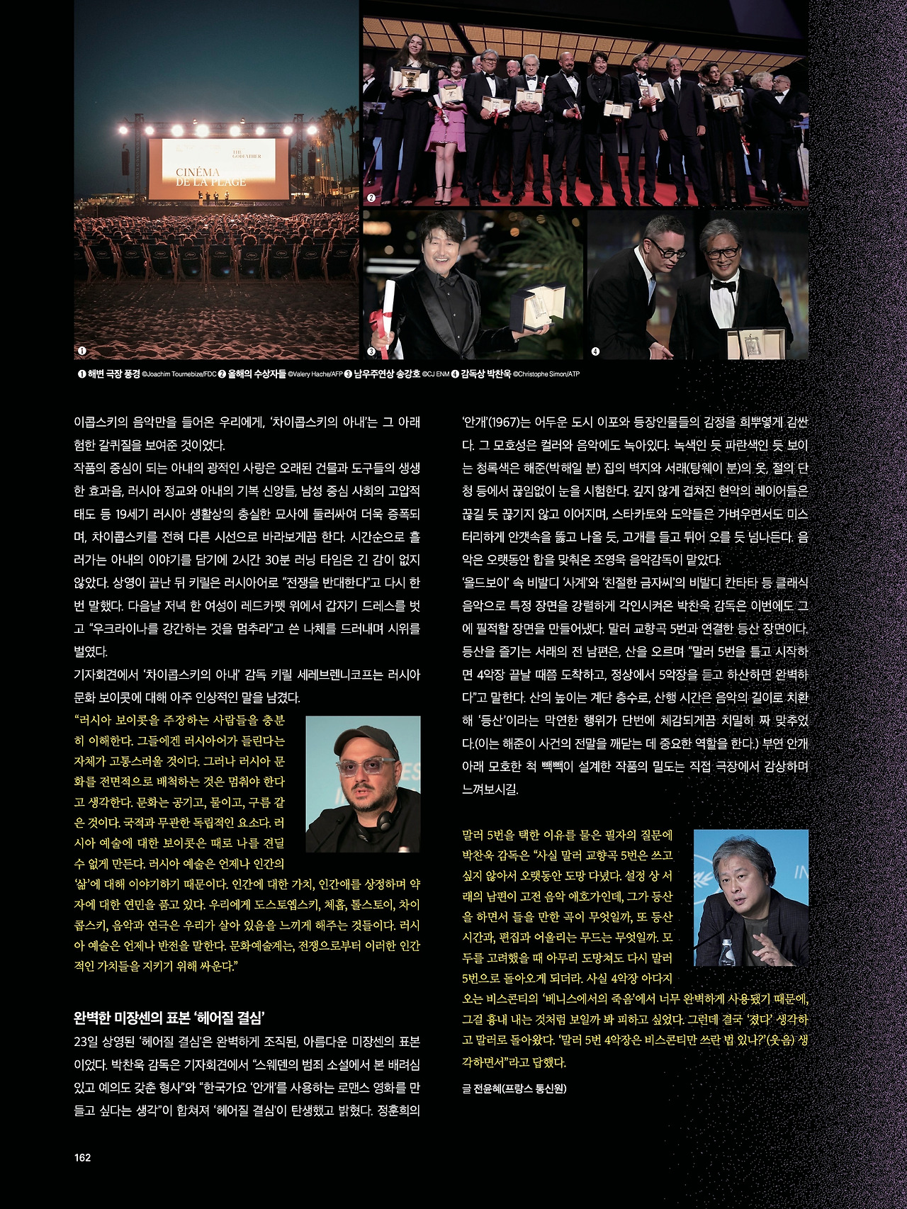 둘째, 키릴의 가택 연금이 올해 해제되어, 6년 만에 칸에 돌아온 것. 모스크바 고골 센터의 예술감독이기도 한 그는 유럽 연극·오페라계에서 탄탄한 입지를 가진 연출가다. 2017년 푸틴은 그를 가택연금시켰다. 표면적 죄목은 ‘고골 센터의 공금 횡령’이지만, 실상은 영화 ‘스튜던트’(2016)에서 러시아 정교와 기성 체제를 비판한 이유로 푸틴의 심기를 건드렸다는 것이 중론이다.