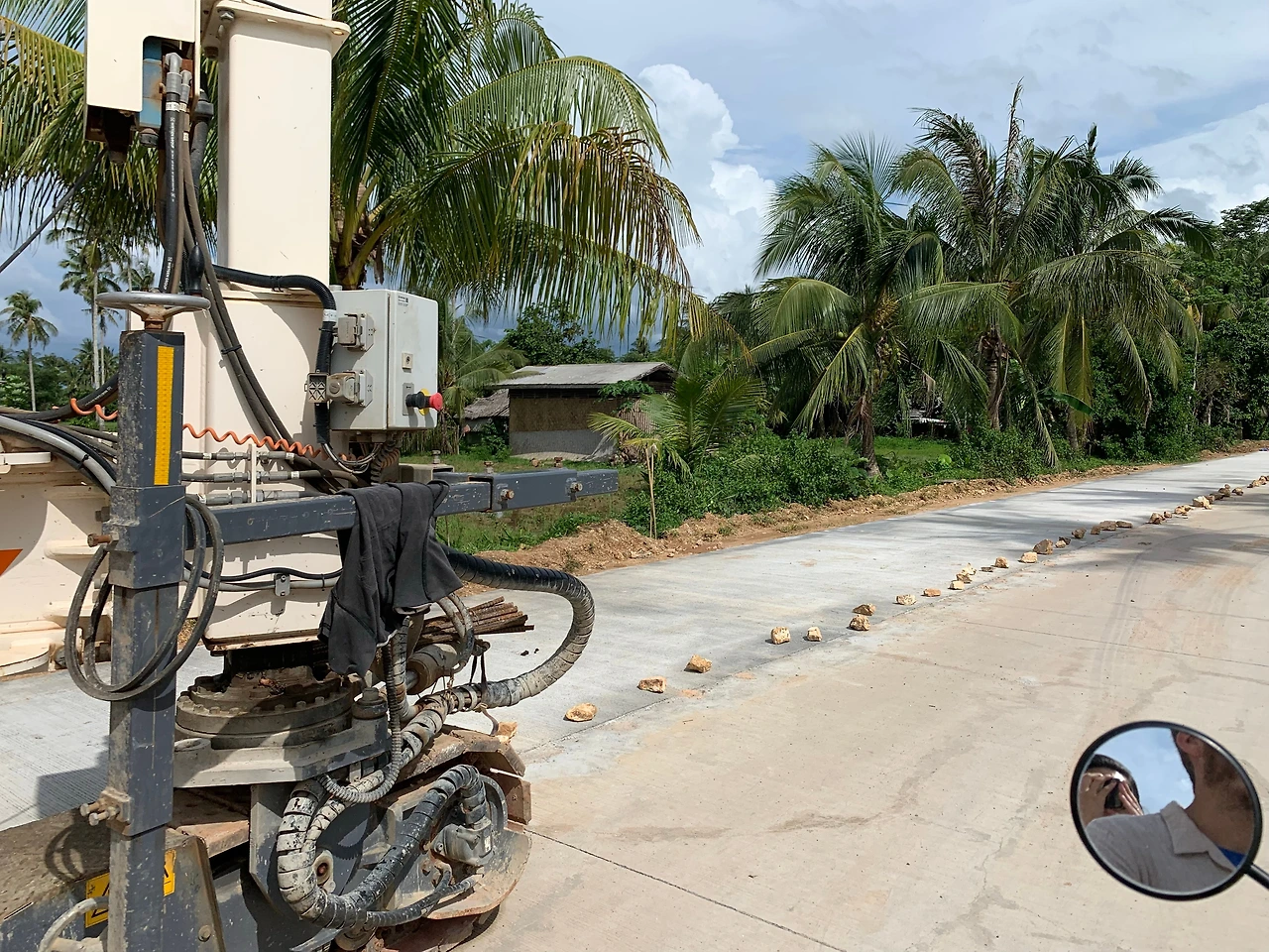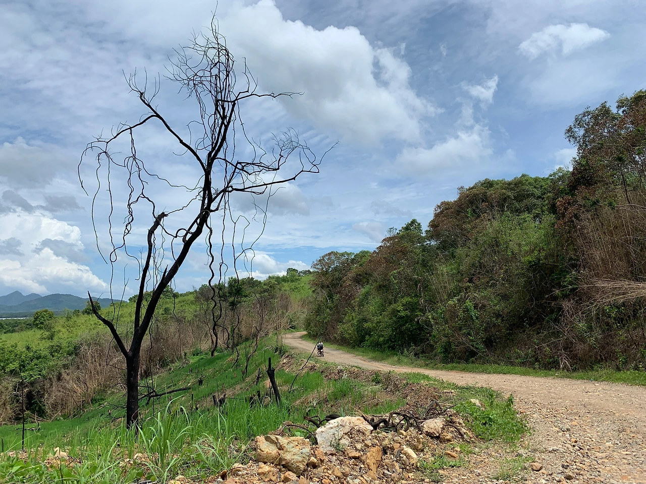 물을 건너자 고대하던 시멘트 도로가 나타난다. 곧 전기도 깔 모양인지 콘크리트 전봇대들이 풀숲에 쌓여 있다. 세워진 전봇대들이 규칙적으로 나타나기 시작한다. 전깃줄이 채 걸리지 않은 모습이 너무 새하얀 새것이라 낯설다. 가다 보니 인부들이 전깃줄을 연결한다. 어떤 구간은 전깃줄이 한 줄이고, 어떤 구간은 두 줄로 늘어난다. 도로도 전봇대도 그 모양이 남쪽으로 갈수록 정연해진다. 마침내 우리는 시멘트 까는 기계를 마주친다. 사람들은 여유롭고 한낮의 태양 아래 빨간 라이트가 번쩍번쩍 돌아간다. 그렇다. 타이타이 내셔널 하이웨이는 덜 지어진 채로 ‘하이웨이’로 등록된 거다. 남쪽부터 시작해 북쪽으로 지어지고 있다.