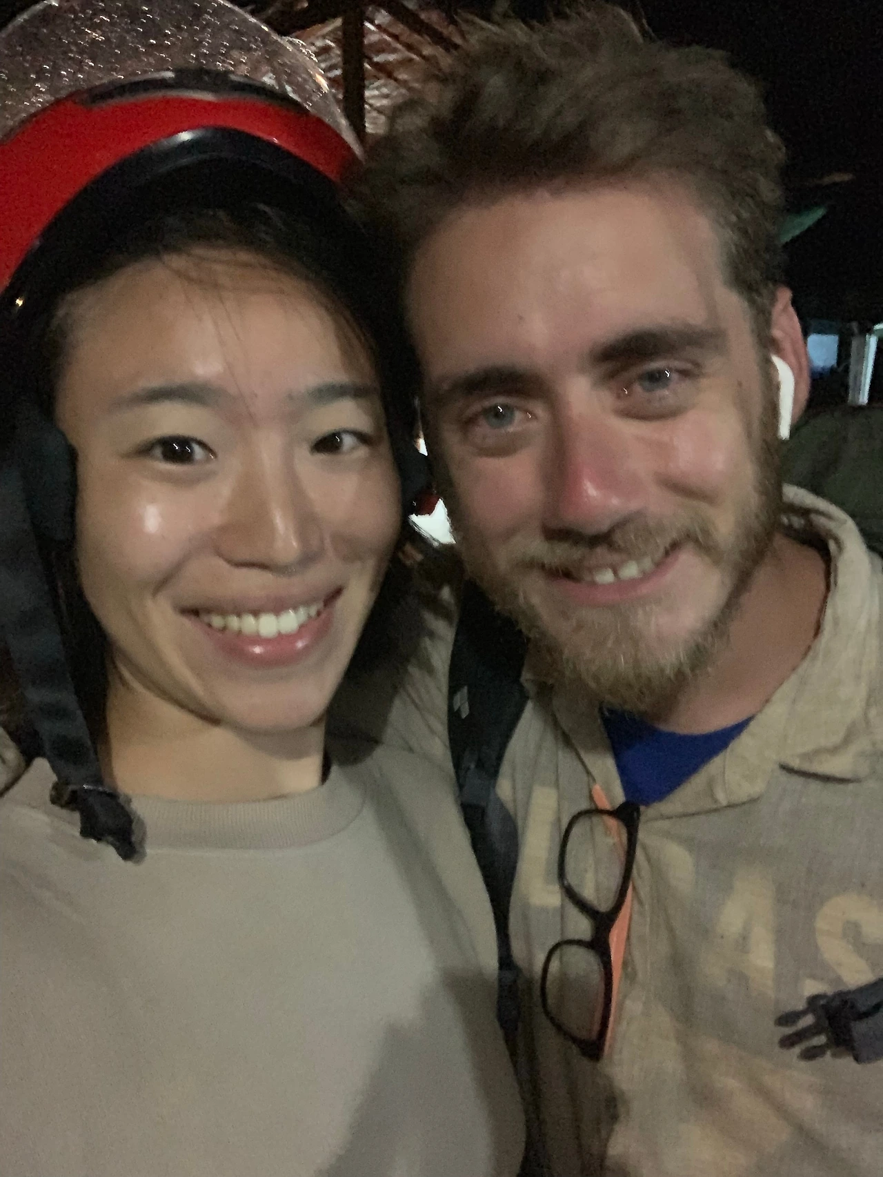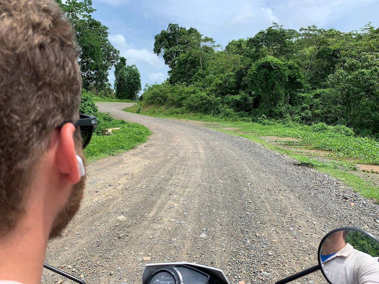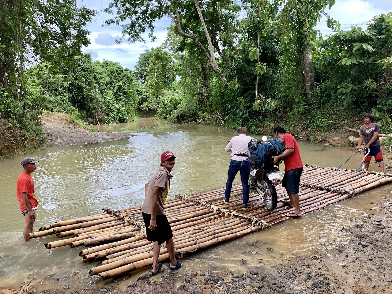 에어팟으로 음성 안내를 받던 니콜라스가 말한다. 약한 시그널 탓에 왕왕 이런 일이 있었지만 그래도 그땐 ‘길’이라도 있었지. 진흙탕에 동그마니 떨어진 우리. 다행히 조금 더 가다 오두막에 앉아 있던 현지인을 발견하고 물어본다. 손짓 발짓으로 가리키는 곳은 아래쪽. 살라맛 뽀(감사합니다)! 어찌 됐든 믿어보자, 조심조심 경사를 내려가자 눈을 의심할 만한 풍경이 나타난다. 뗏목. 비에 불어난 물 때문에 도로(흙길)가 잠긴 건지, 다리가 무너진 건지 알 턱이 없다. 다만 네 명의 인부가 뗏목을 끌어주고 돈을 받는 걸로 보아 자주 있는 일인 것 같다. 얼떨결에 인생 처음으로 뗏목을 탄다. 인생 처음 모터바이크 여행에서, 모터바이크와 함께 뗏목을 타다니.