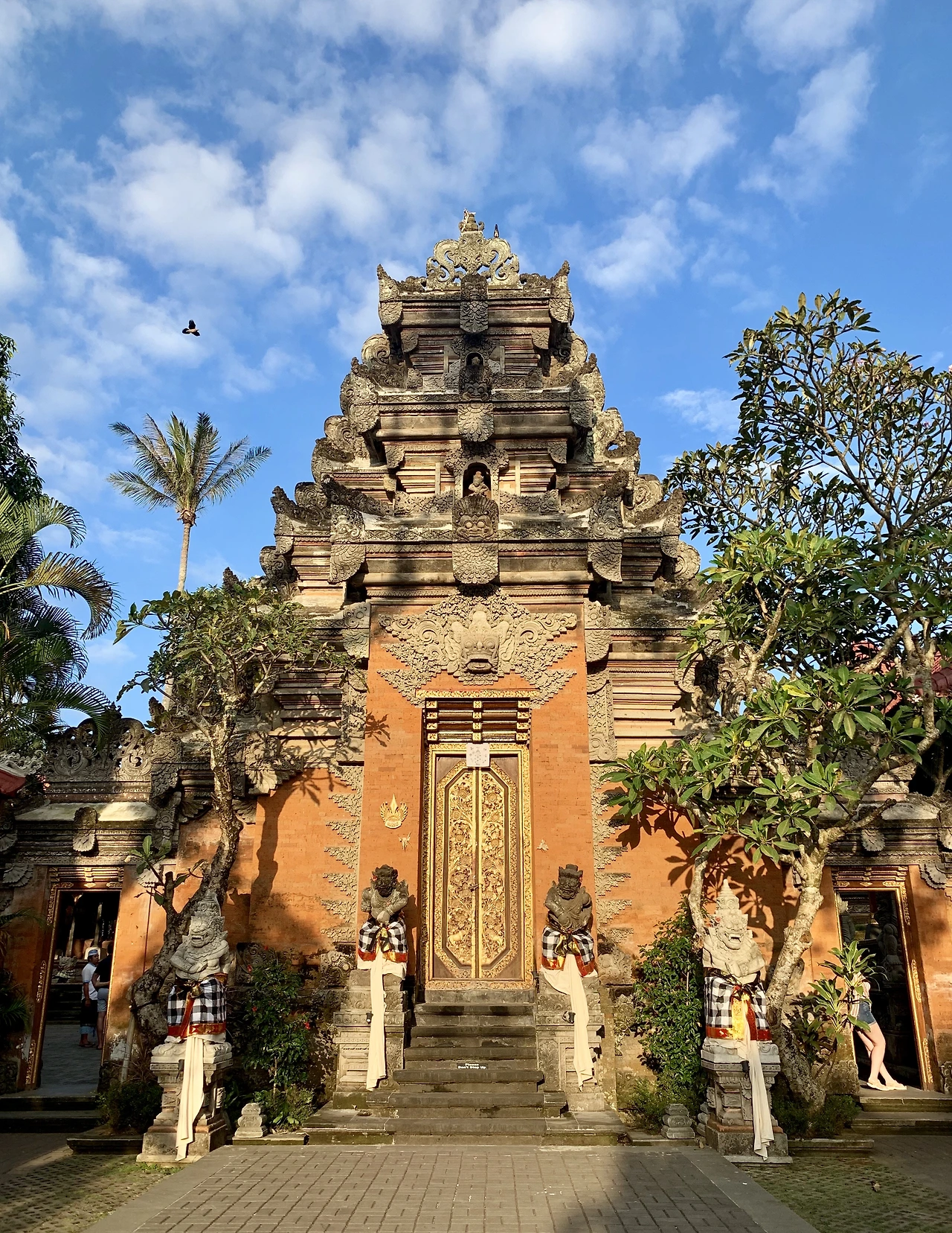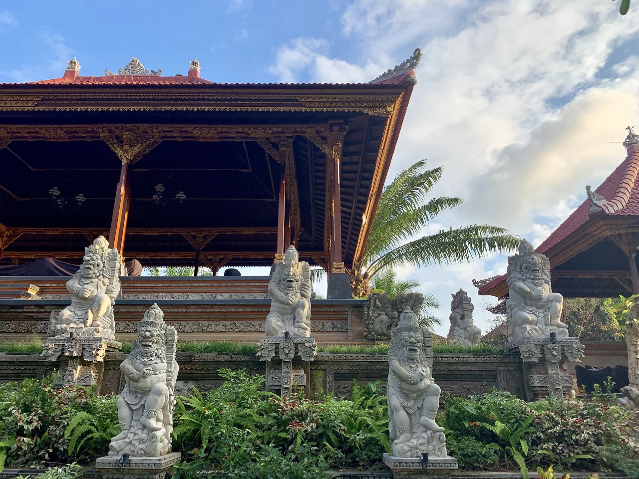 우붓은 해질 무렵이 가장 활기차다. 투어를 다녀온 사람들이 차에서 하나둘 내릴 무렵이자 일찍 도착한 사람들이 우붓 마켓에서 기념품 쇼핑을 마치거나 마사지를 받고 나올 무렵, 혹은 숙소에서 쉬던 사람들이 저녁을 먹으러 나오는 무렵. 아침부터 일정을 보내던 사람들이 각자의 방식으로 발리의 저녁을 맞이하는 그 무렵, 우리는 우붓 메인 로드에 도착한다. 아침엔 자연을 실컷 봤으니 이젠 사람이 만든 걸 보자. 스쿠터로 정처 없이 떠돌다 멋진 건물을 보고 멈춘다. 얇은 기둥이 인 금각 지붕이 돌담따라 이어진다. 군데군데 선 석상이 섬세하다. 우붓 중심가 사거리 동북쪽, 작은 우붓만큼이나 작은 왕궁인 우붓 왕궁이다.